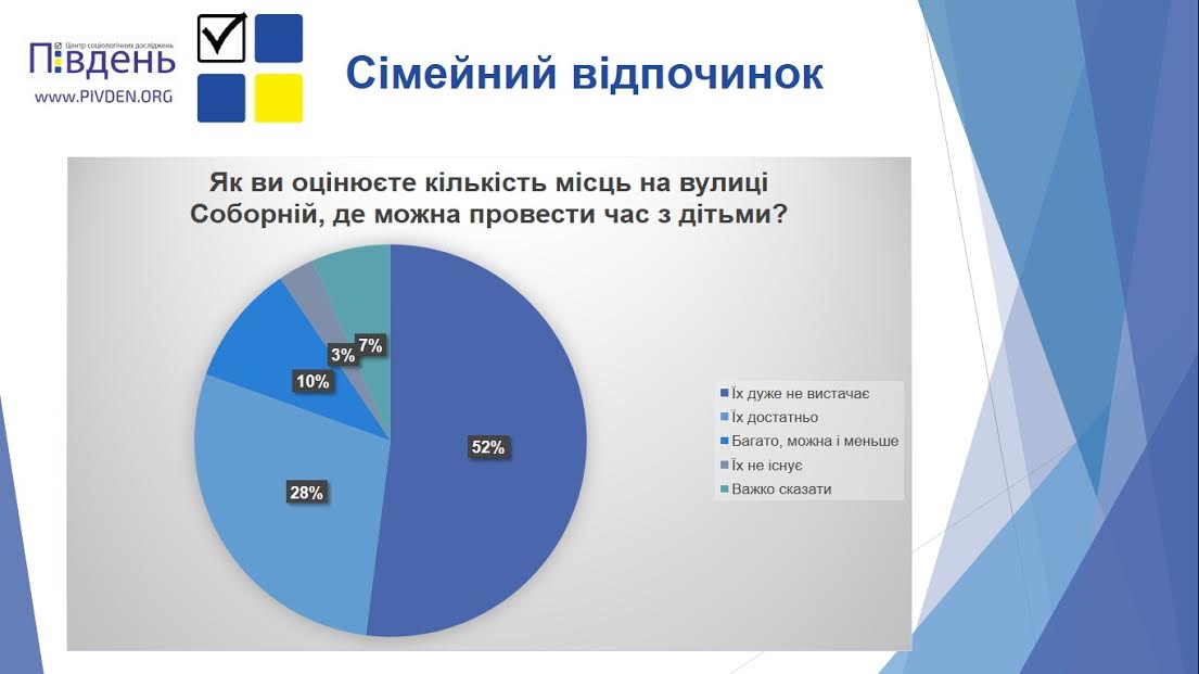 При том, что подавляющее большинство николаевцев проводит свободное время на главной улице города, больше половины респондентов отметили, что на Соборной катастрофично не хватает мест, где можно провести время с детьми (52%), а это значительный показатель, на который стоит обратить внимание.