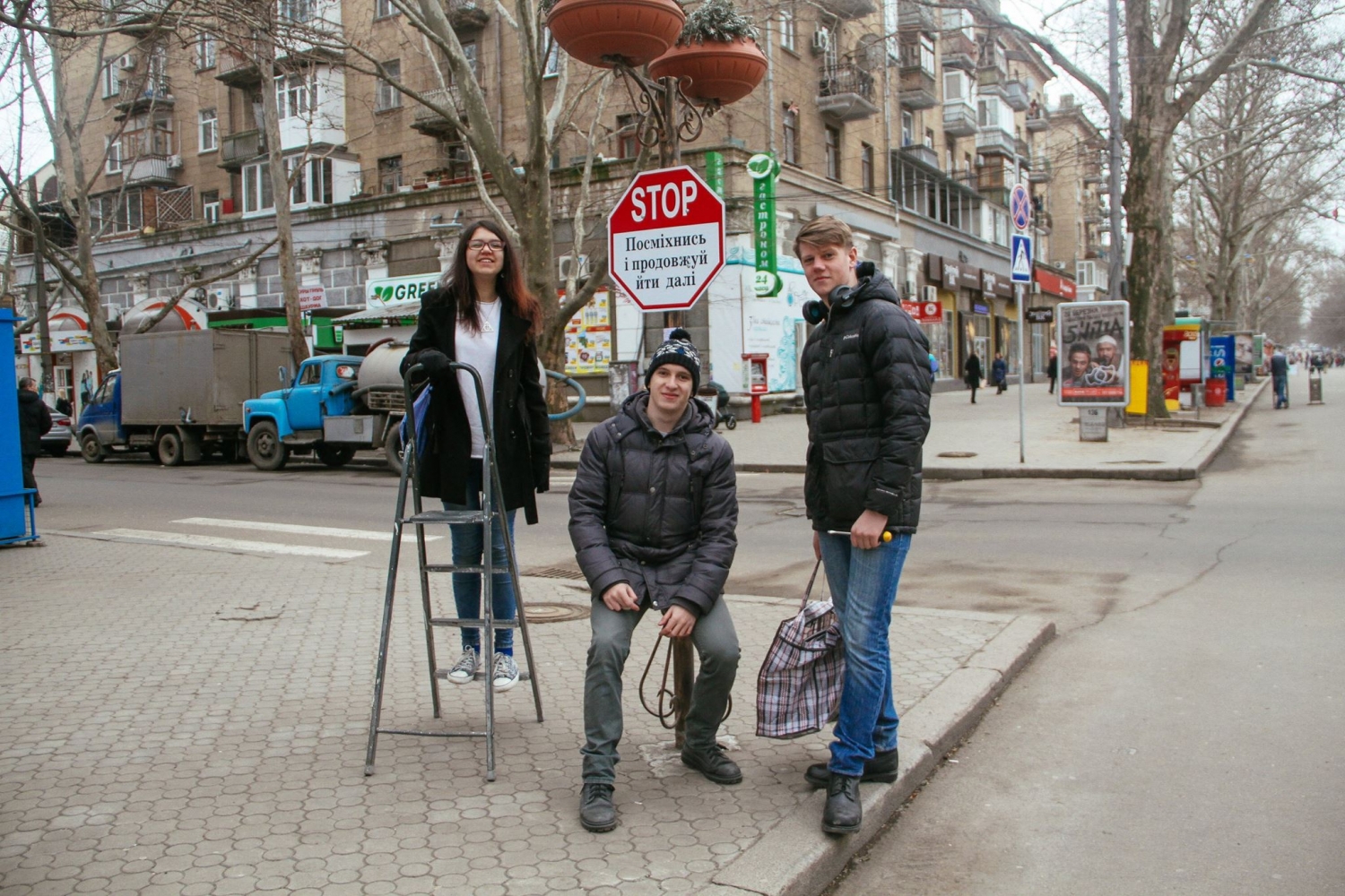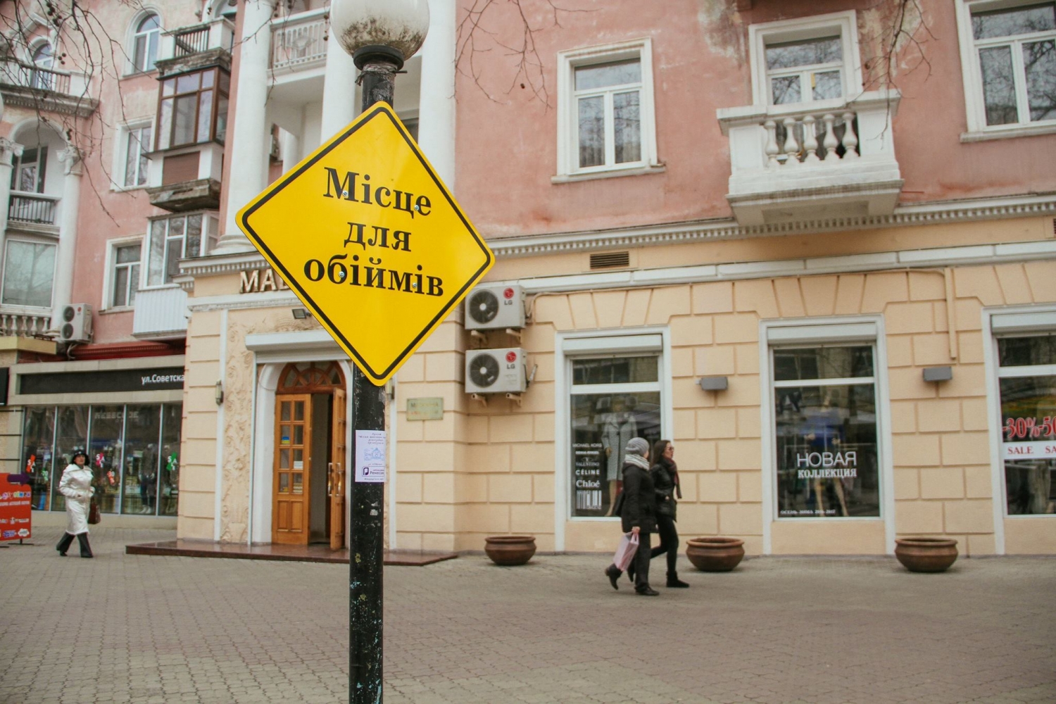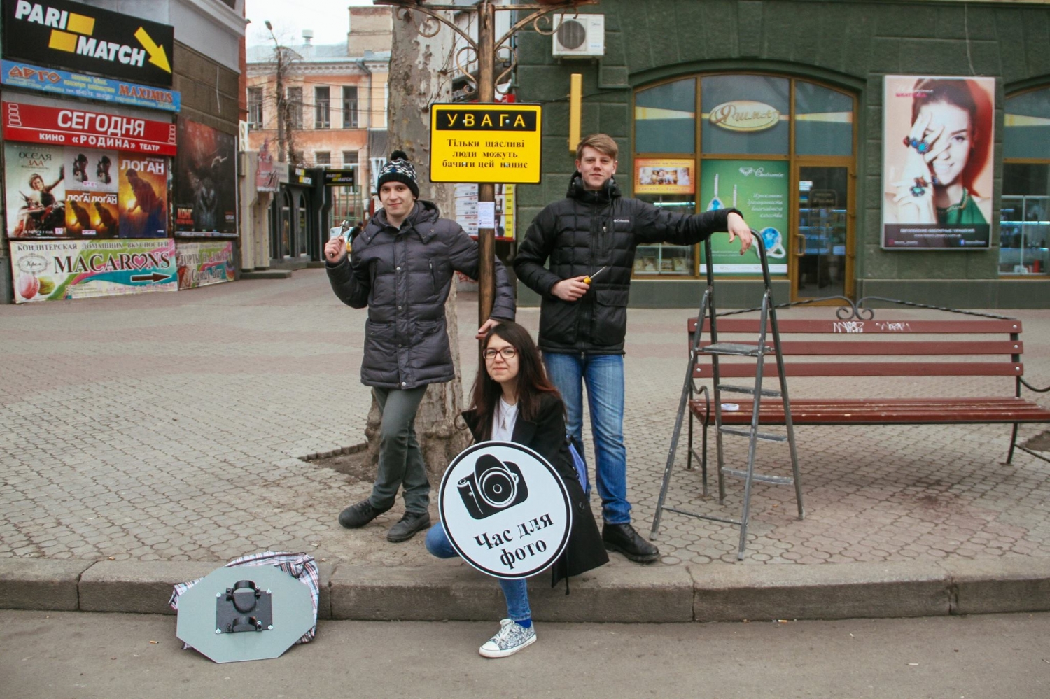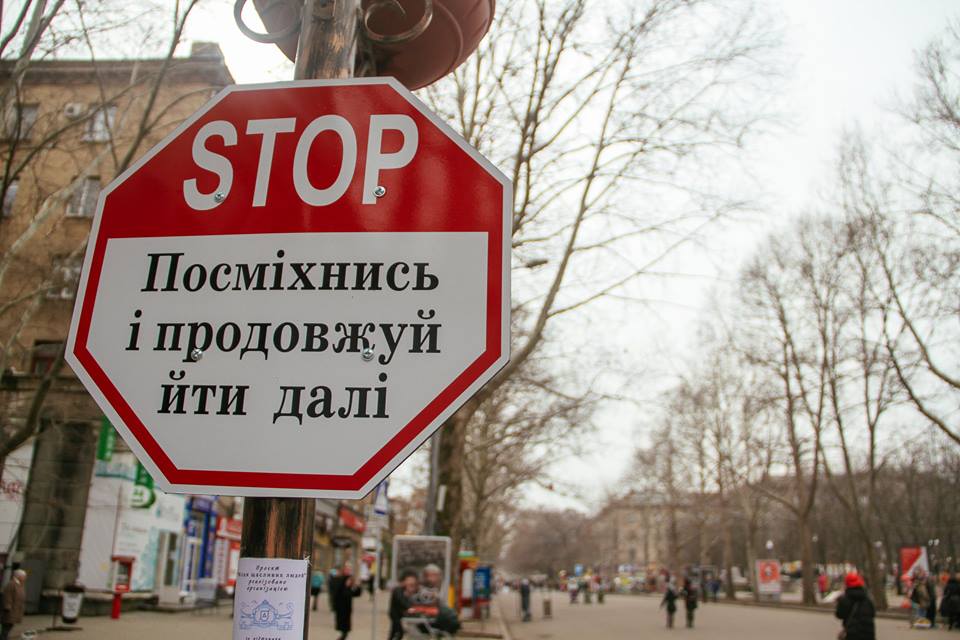 3 марта на центральной улице Соборной появилось четыре вывески, стилизованных под знаки дорожного движения с различными надписями: «Место для фото», «Остановись и улыбнись», «Только счастливые люди могут видеть эту надпись», «Место для объятий».