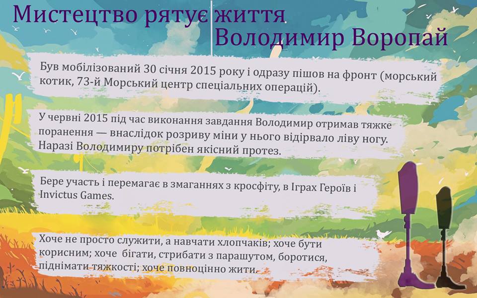 Итогом проекта станет благотворительная выставка-продажа. Каждый, кто приобретет картину, тем самым окажет помощь «морскому котику», молодому бойцу Владимиру Воропаю. Парень был мобилизован в январе 2015 года и попал в бригаду, которая дислоцировалась недалеко от Мариуполя. В июне 2016 года во время выполнения боевого задания получил тяжелое ранение. От разрыва мины ему оторвало левую ногу.