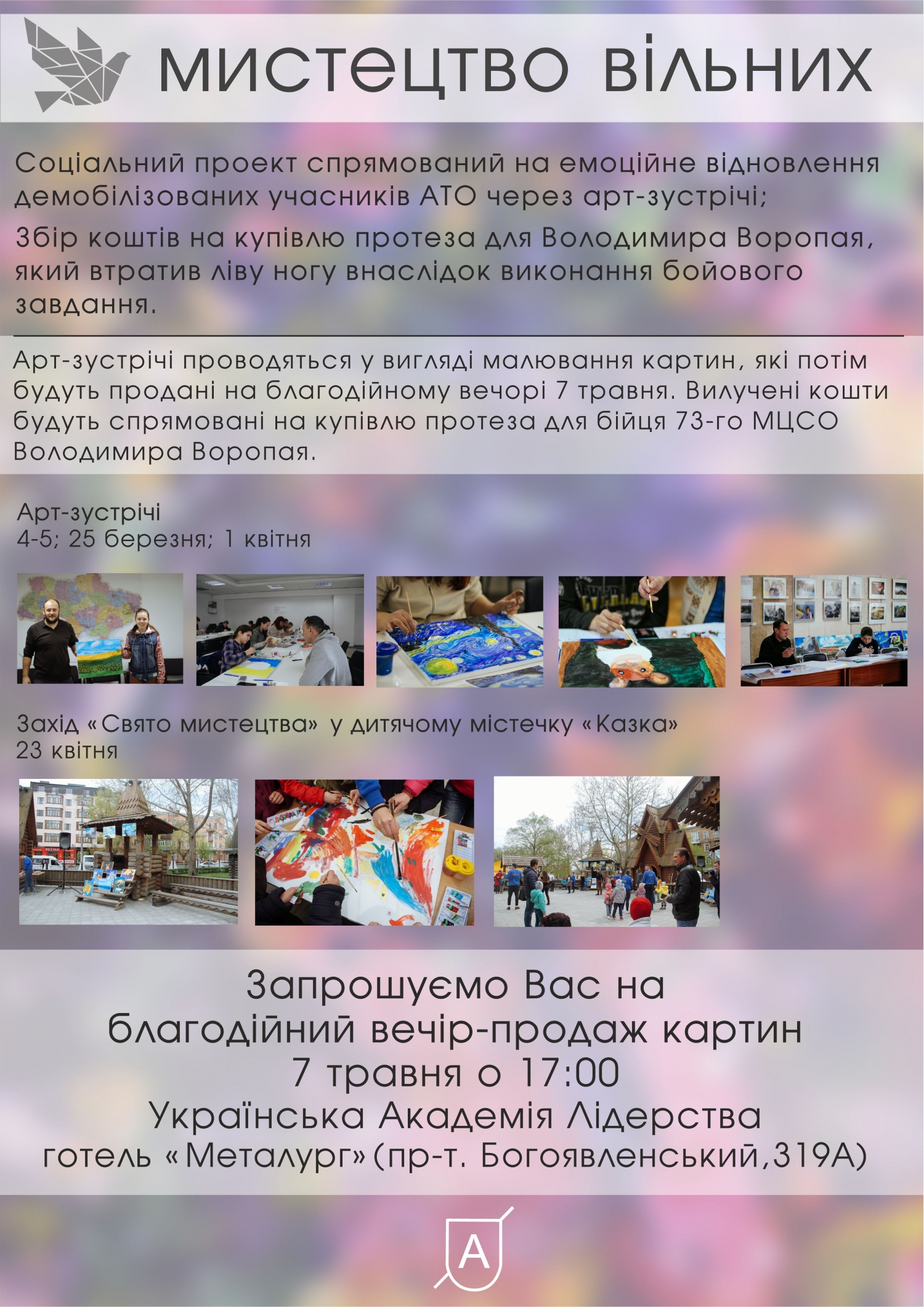 Проект «Искусство свободных» состоял из двух частей: первая – арт-терапия для демобилизованных участников АТО и их детей, которая проводилась 4-5, 25 марта и 1 апреля; вторая часть – благотворительный вечер и выставка-продажа картин.