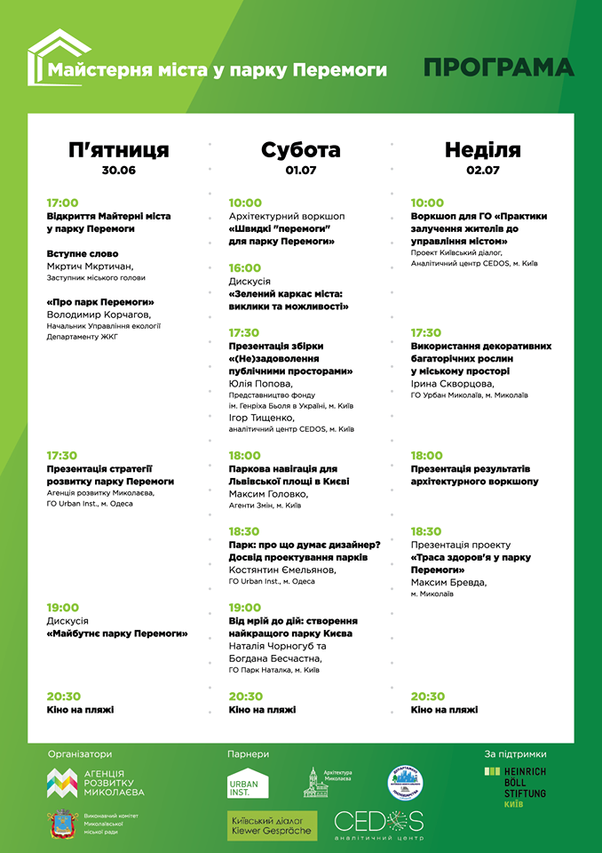 С 30 июня по 2 июля, в парке Победы, возле волейбольной площадки, пройдет урбанистический фестиваль «Майстерня міста». В течение 3 дней каждый посетитель парка может стать участником интересных лекций и презентаций, послушать представителей власти о проблемах зеленых зон города, принять участие в увлекательных дискуссиях и воркшопах.