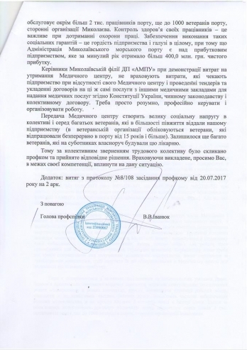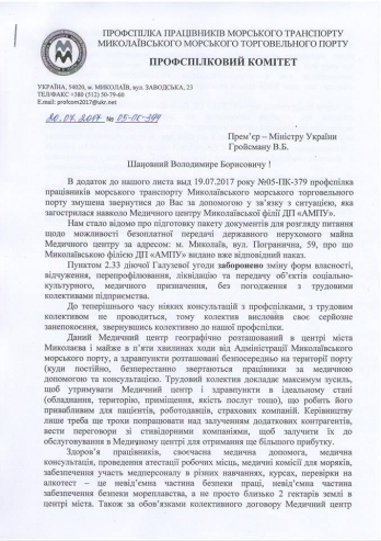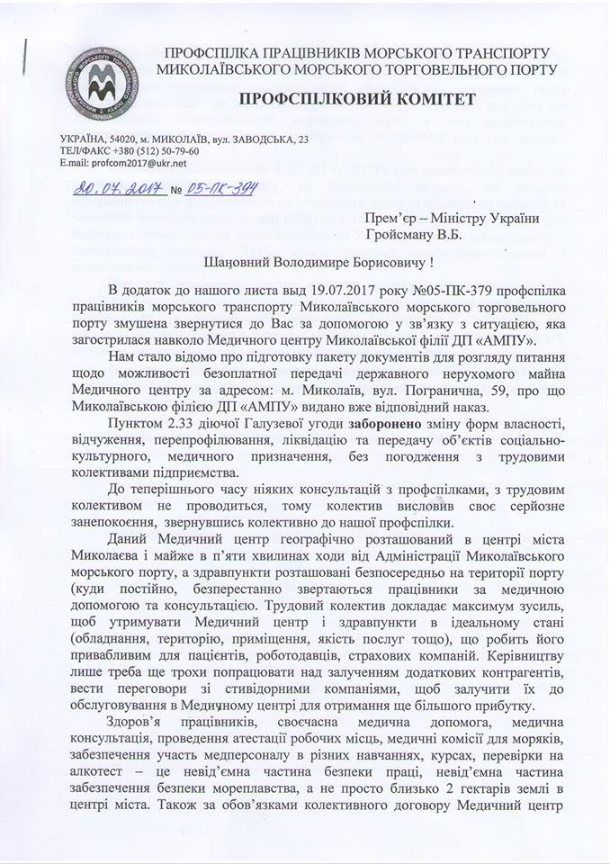 Члены профсоюза Николаевского морского порта написали письмо на имя премьер-министра Украины Владимира Гройсмана с просьбой помочь с ситуацией, которая обострилась вокруг Медицинского центра Николаевского филиала ГП «АМПУ».