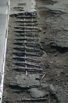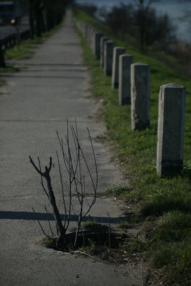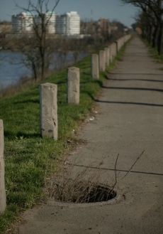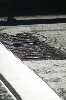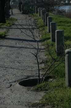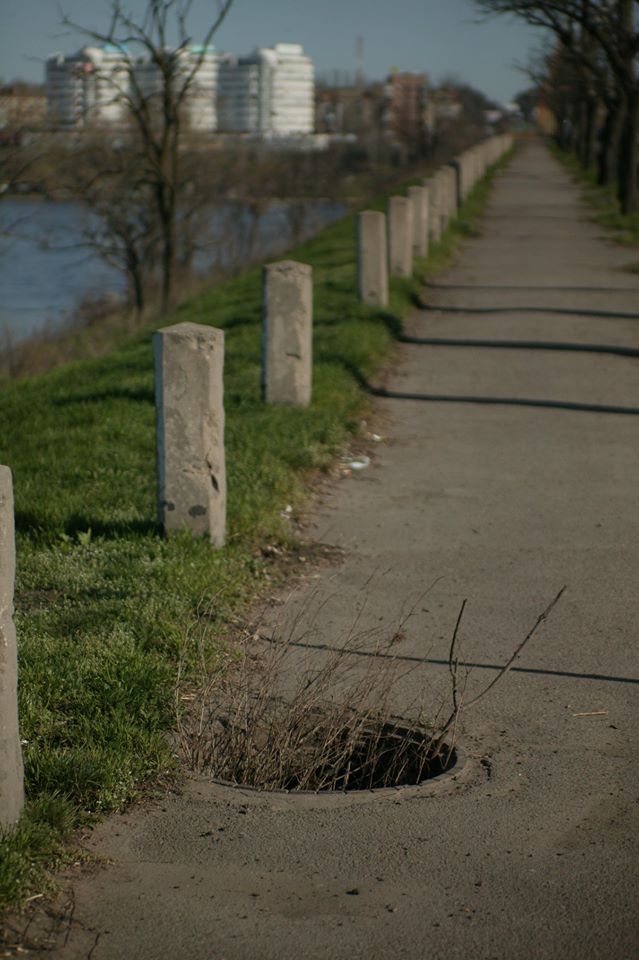 Также Александр Сайковский сфотографировал пешеходную дорогу у моста с несколькими открытыми люками, из которых торчат ветки.