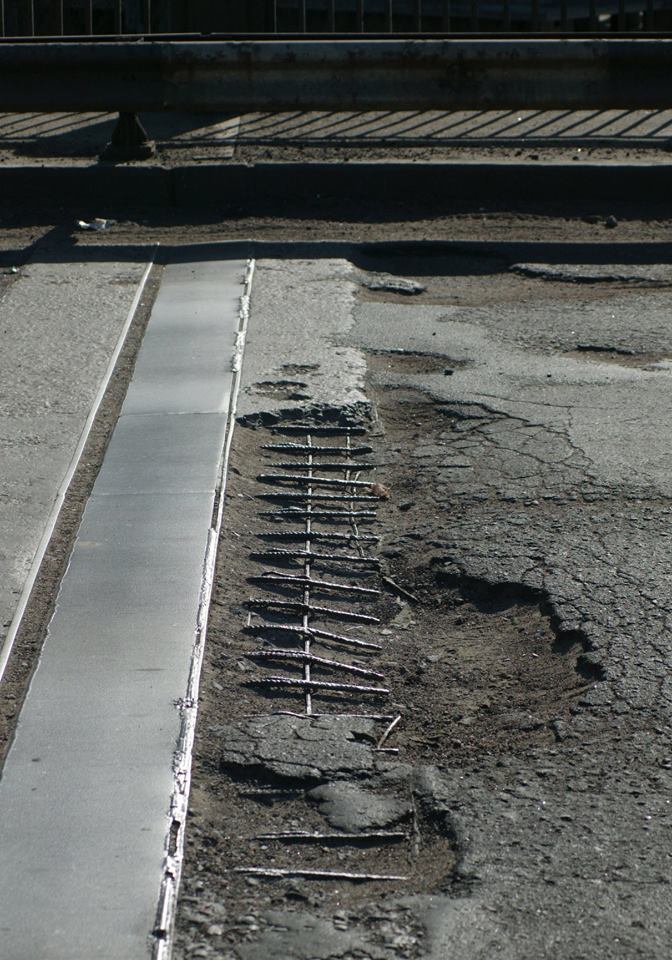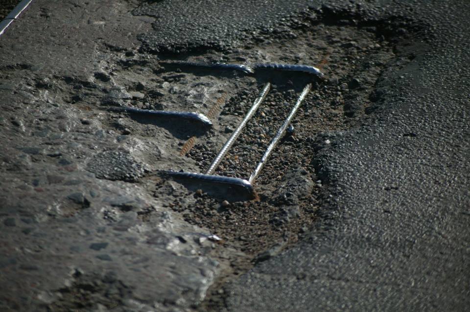 На фотографиях виден оголенный металл без асфальтного покрытия, глубокие ямы и стыки моста, которые, судя по фотографиям, прилегают друг к другу не плотно.
