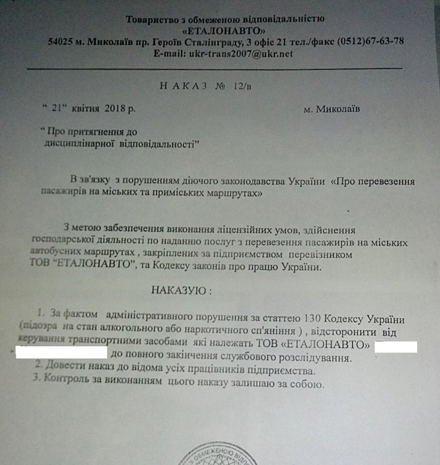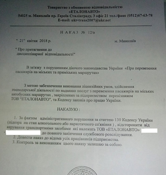 — Во исполнение рекомендаций управления транспортного комплекса, связи и телекоммуникаций Николаевского городского совета, руководство предприятия-перевозчика ООО "Эталонавто" отстранило от управления транспортными средствами вышеупомянутого водителя до полного окончания служебного расследования, - сказано в сообщении.