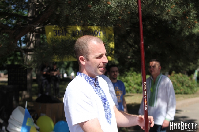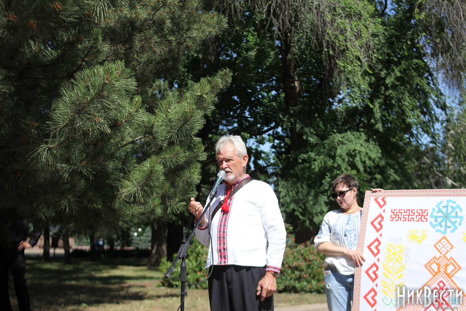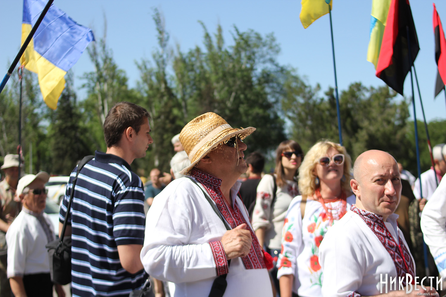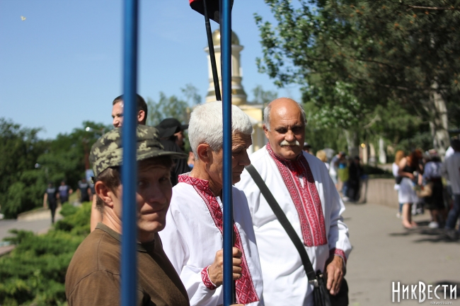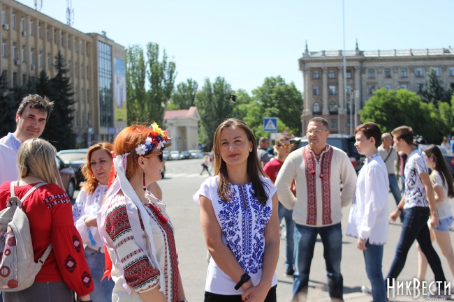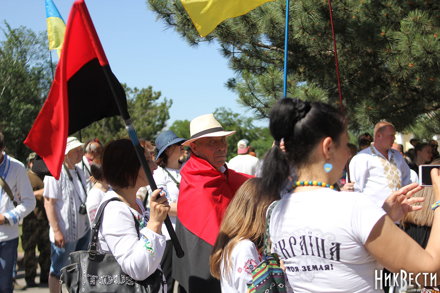 В 14.00 у памятника Героям небесной сотни на улице Садовой собрались николаевцы, одетые в вышиванки, многие пришли с флагами Украины.