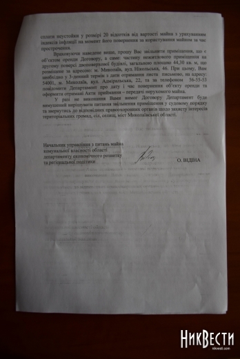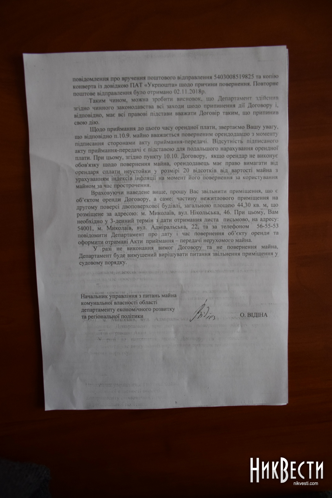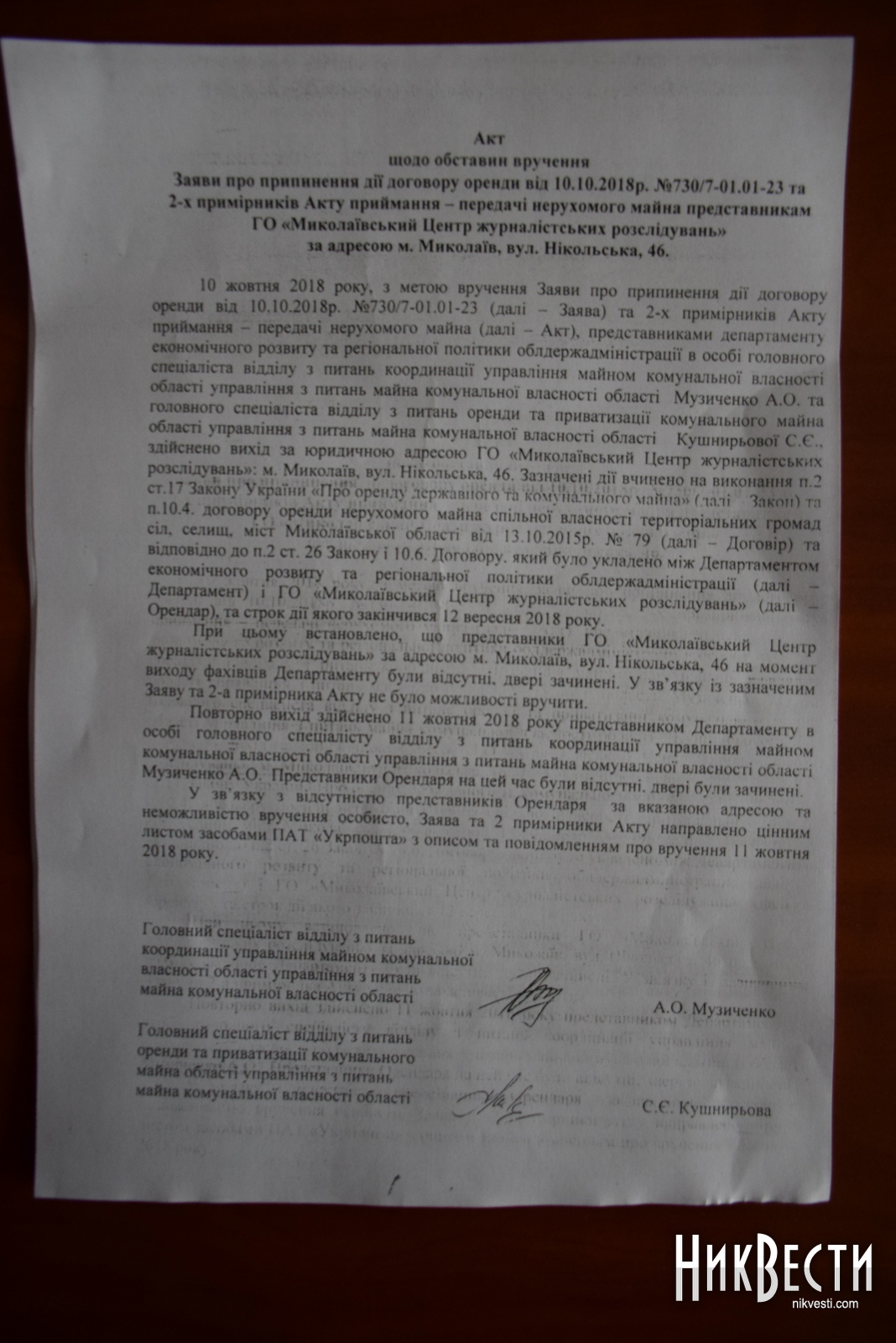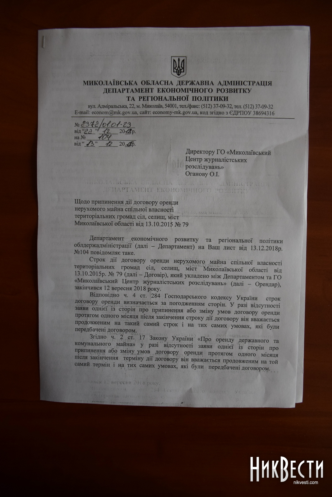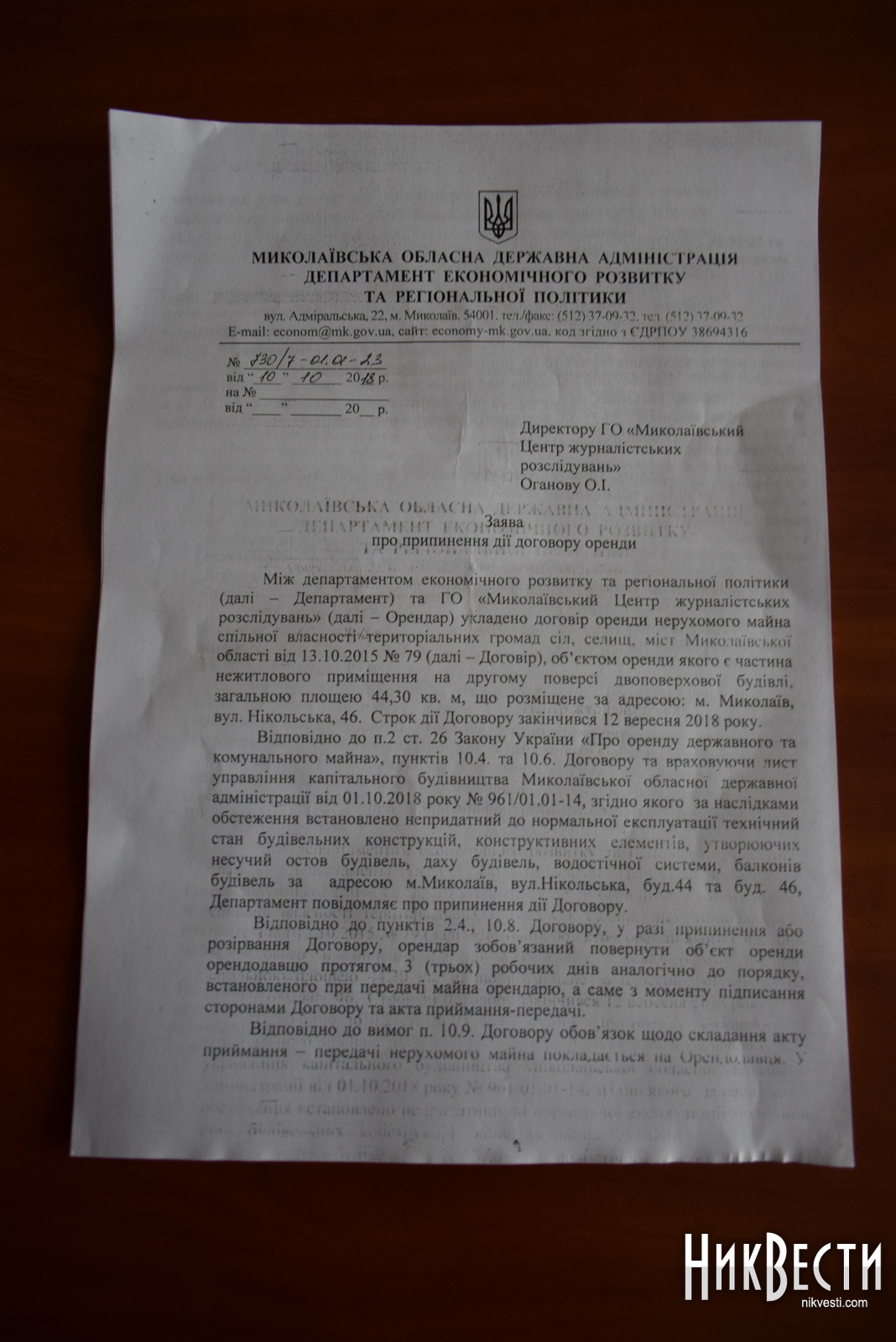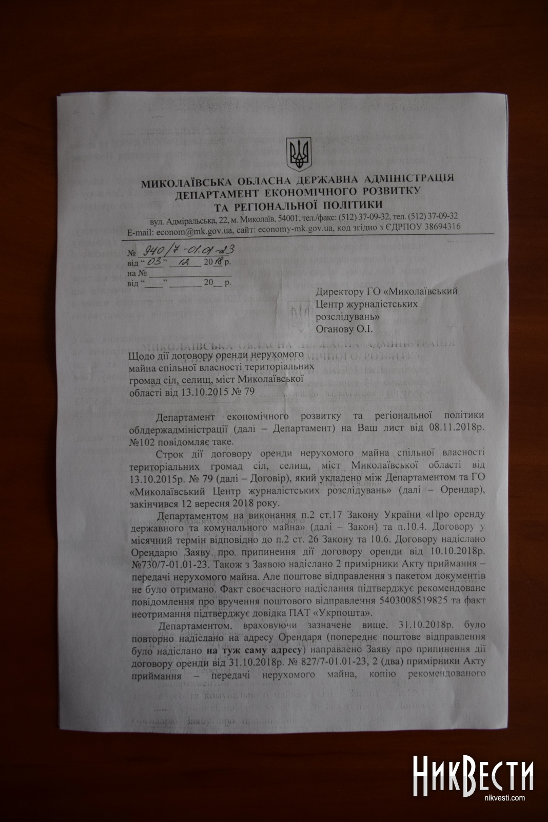 Управление по вопросам имущества коммунальной собственности Николаевской ОГА через суд пытается выселить из здания на улице Никольской, 46 ОО «Николаевский Центр журналистских расследований».