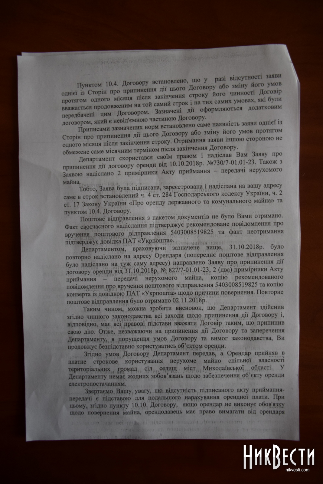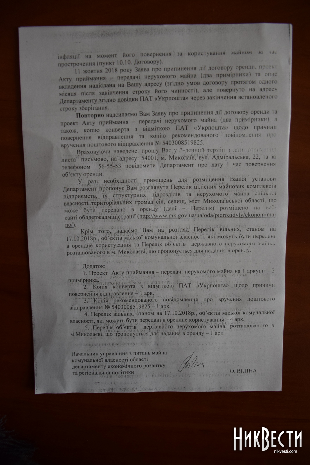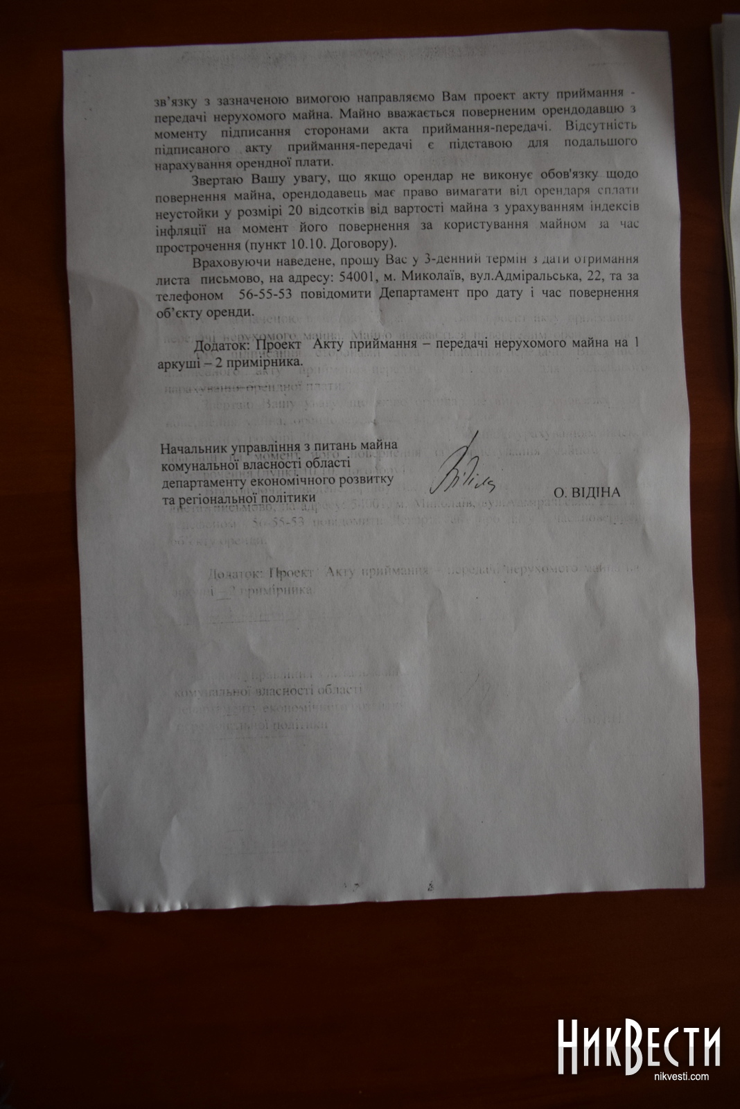Также она отметила, что в Николаевской ОГА не рассматривают вопрос о сносе здания, поскольку оно является памяткой архитектуры.
