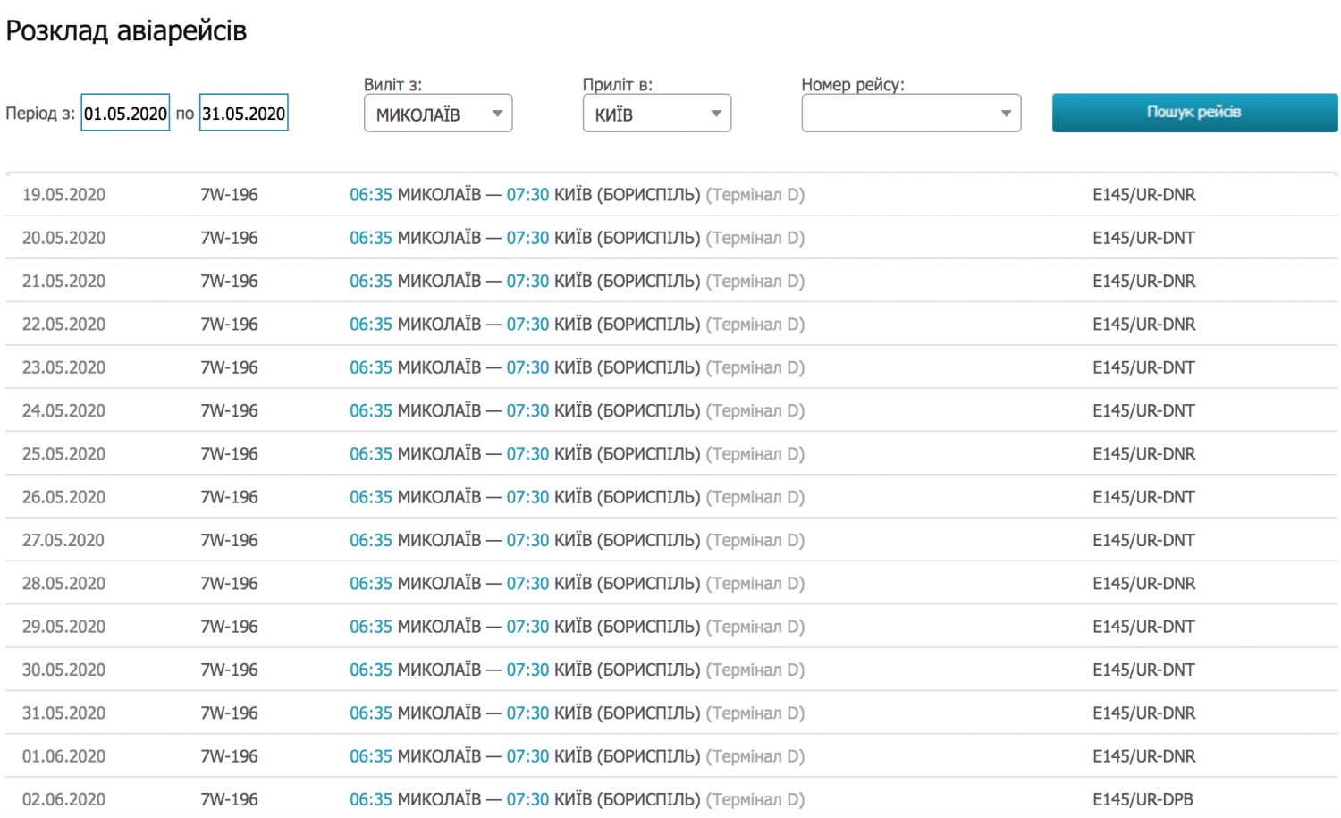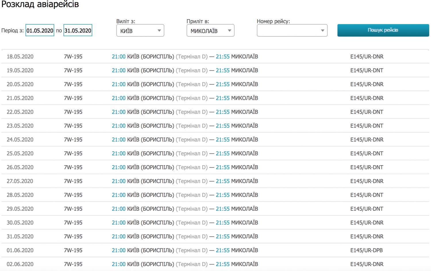 График предусматривает вылет самолета рейсом 7W-195 из киевского аэропорта «Борисполь» в 21:00 с прибытием в Николаев в 21:55. Обратный рейс 7W-196 будет вылетать из Николаева на следующий день в 06:35 с прибытием в Киев в 07:30.