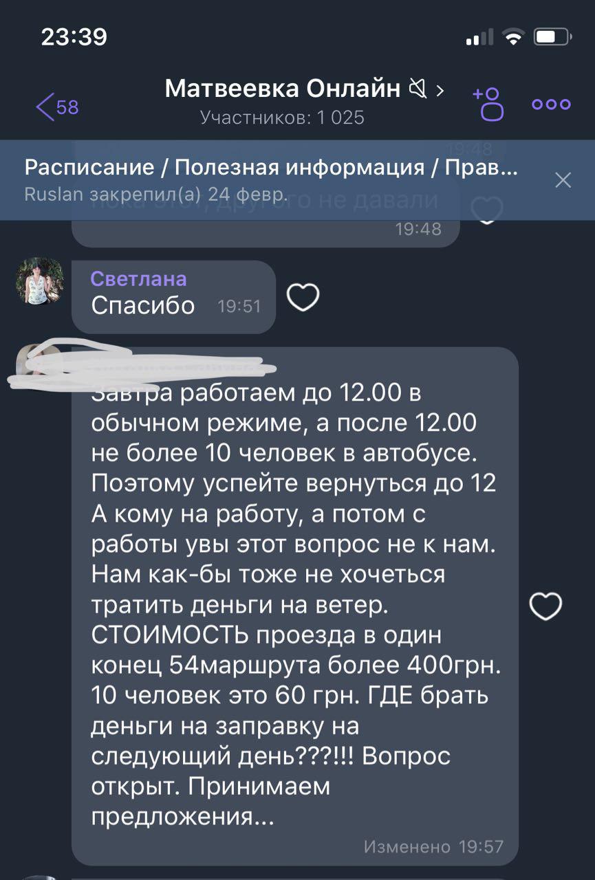 Об этом в Вайбер группе «Матвеевка Онлайн» написала представительница «Евротранстехсервис», чьи автобусы работают на указанном маршруте.
