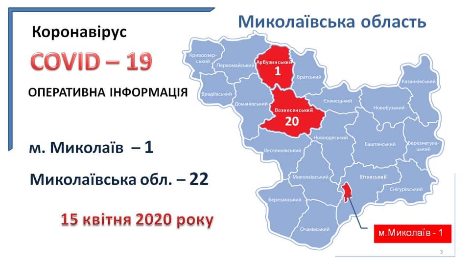 Спустя несколько дней, 11 апреля на Николаевщине было зафиксировано два первых случая заболевания коронавирусом. Уже 12 апреля количество инфицированных в области составило 5 человек, а 14 апреля количество больных COVID-19 в Николаевской области выросло до 14 человек. При этом, все случаи зарегистрированы в Вознесенском районе.