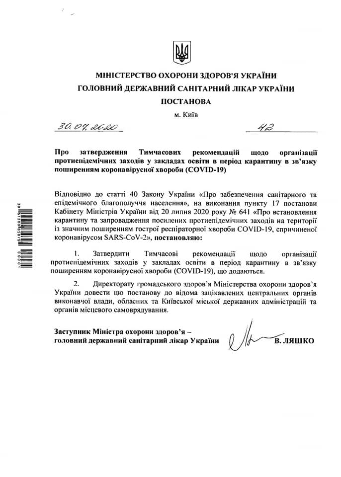 Главный санитарный врач Украины Виктор Ляшко 30 июля утвердил рекомендации по организации обучения с 1 сентября во всех учреждениях образования.