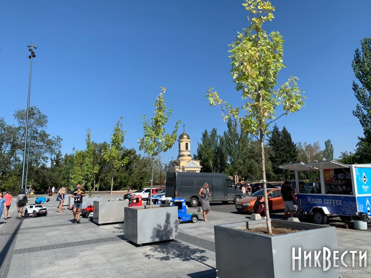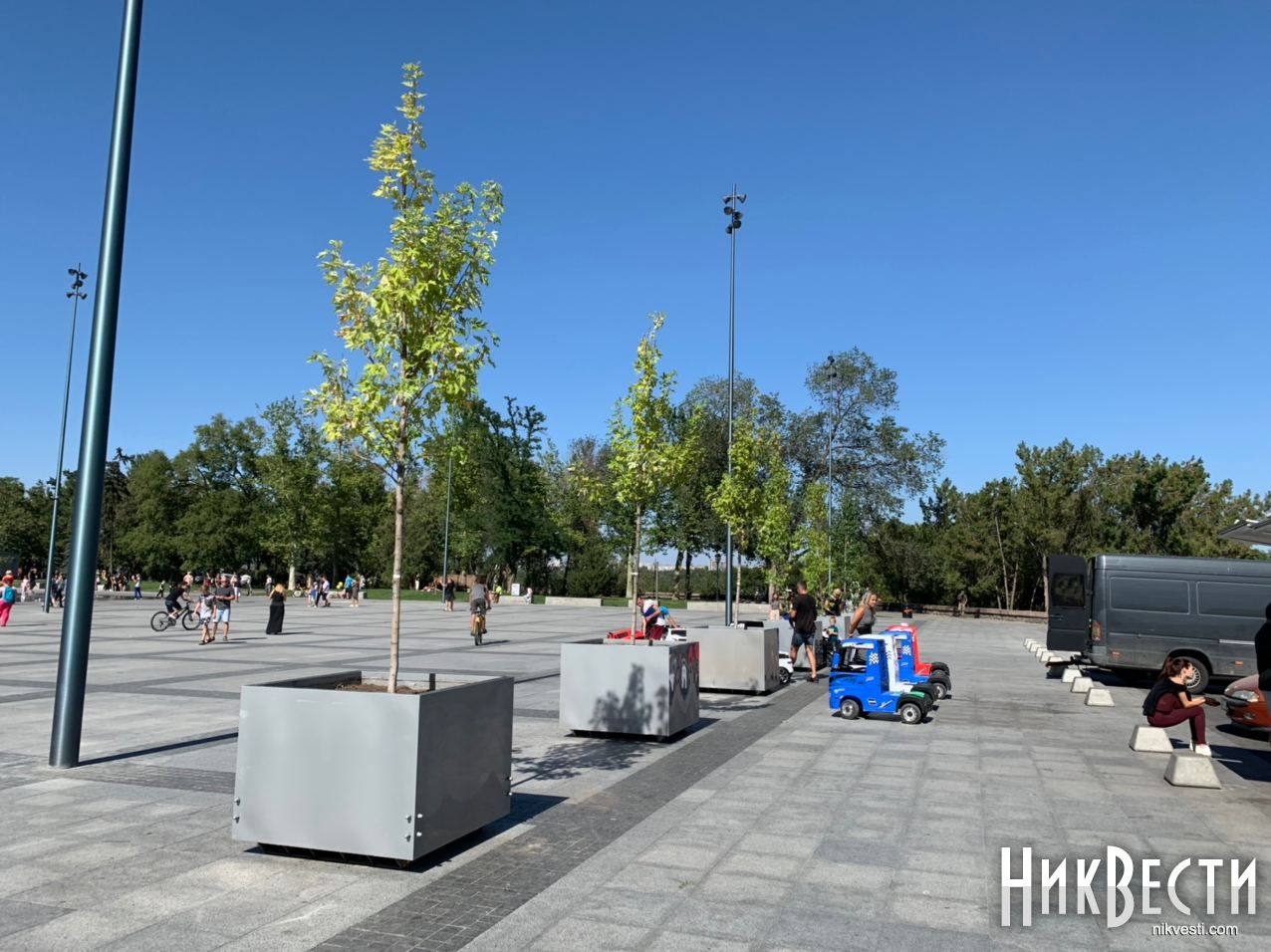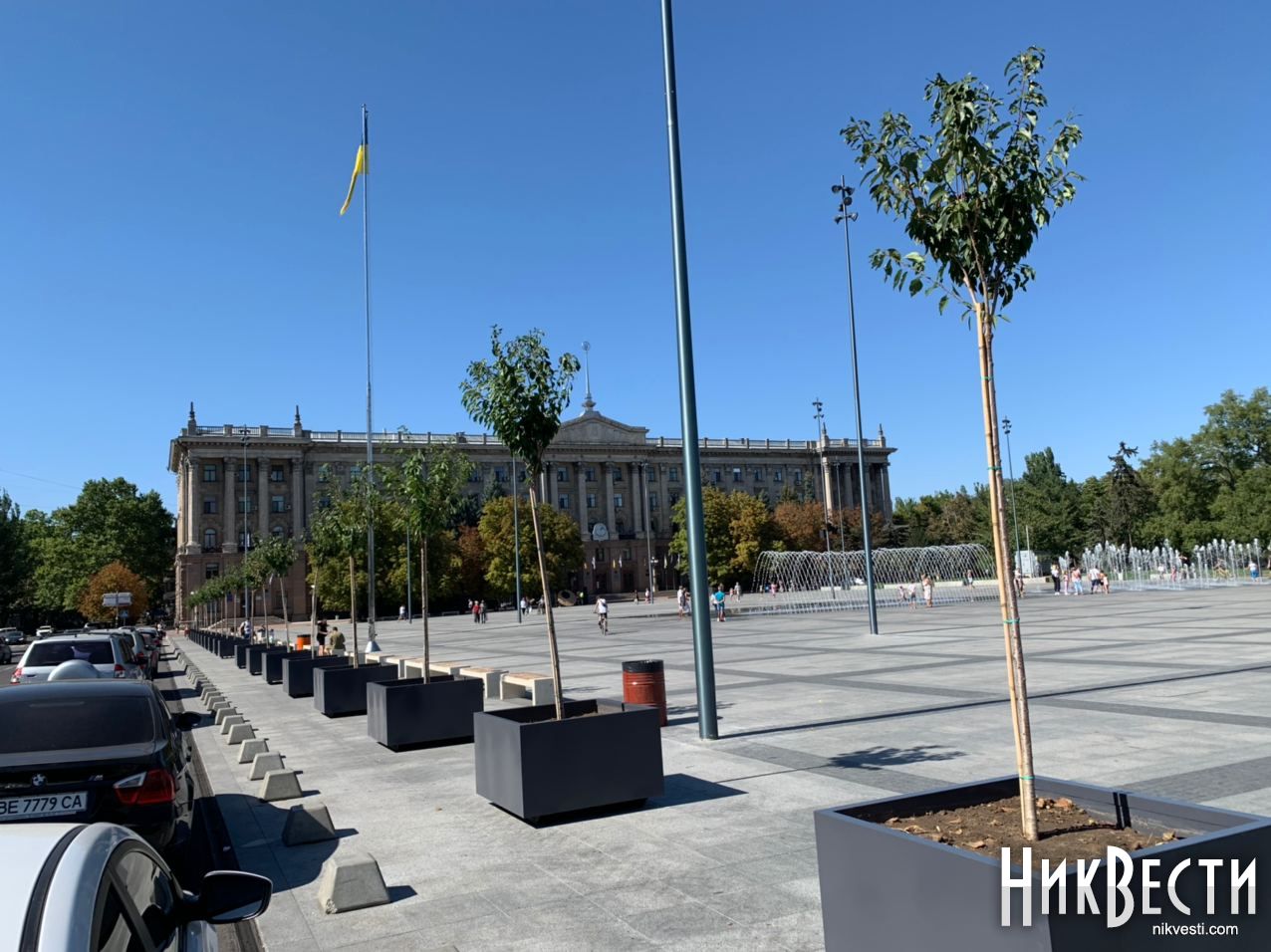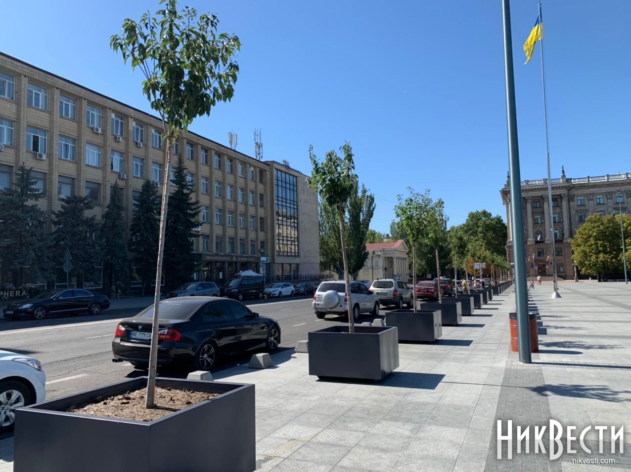 В Николаев, в День города на Соборной площади установили кадки с живыми деревья.