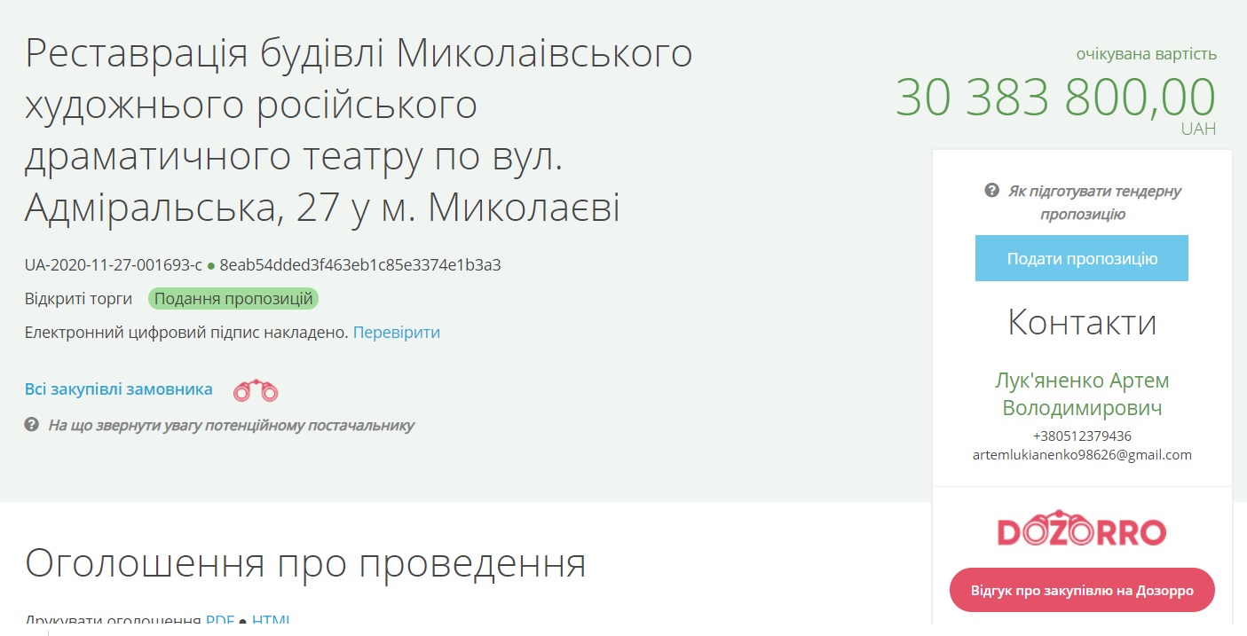 Торги были объявлены 27 ноября, аукцион запланирован на 15 декабря. Ожидаемая стоимость работ — 30 миллионов 383 тысячи 800 гривен. Согласно условиям договора, стоимость работ может измениться, сам проект является переходящим, предварительно, реставрацию подрядчик должен будет закончить до конца следующего года.