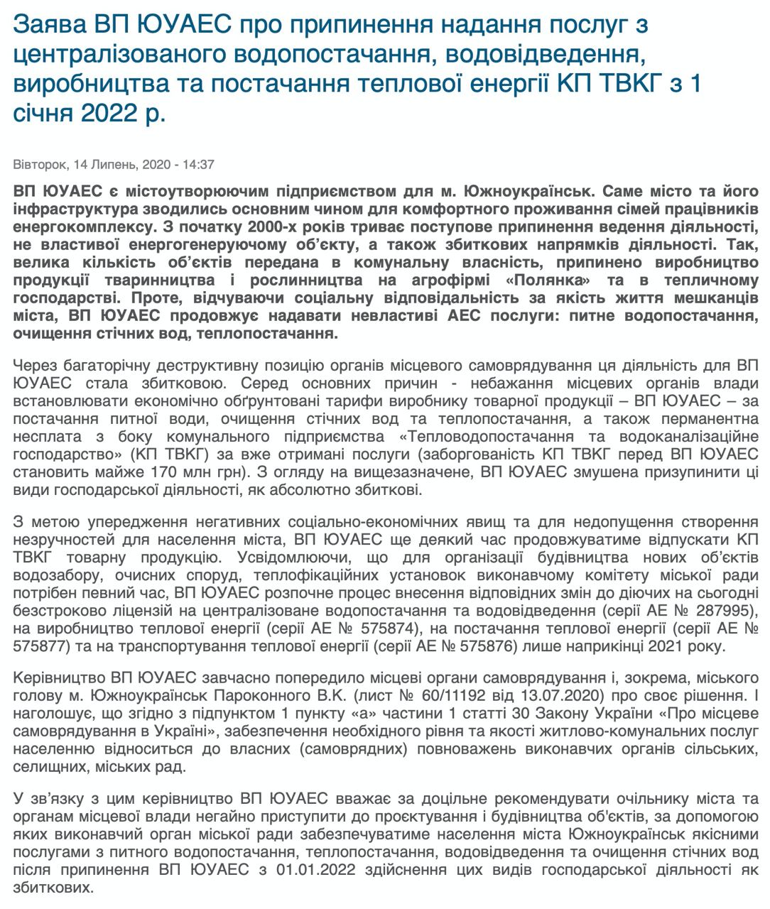 Еще в июле прошлого года предприятие заявило от намерений отказаться от предоставления услуг по централизованному водоснабжению и водоотведению в Южноукраинске с 2022 года, а также теплоснабжения и очистки сточных вод. Тогда ЮУАЭС обратилась к руководству города с рекомендацией немедленно заняться проектировкой и строительством объектов, которые будут обеспечивать население качественными услугами.