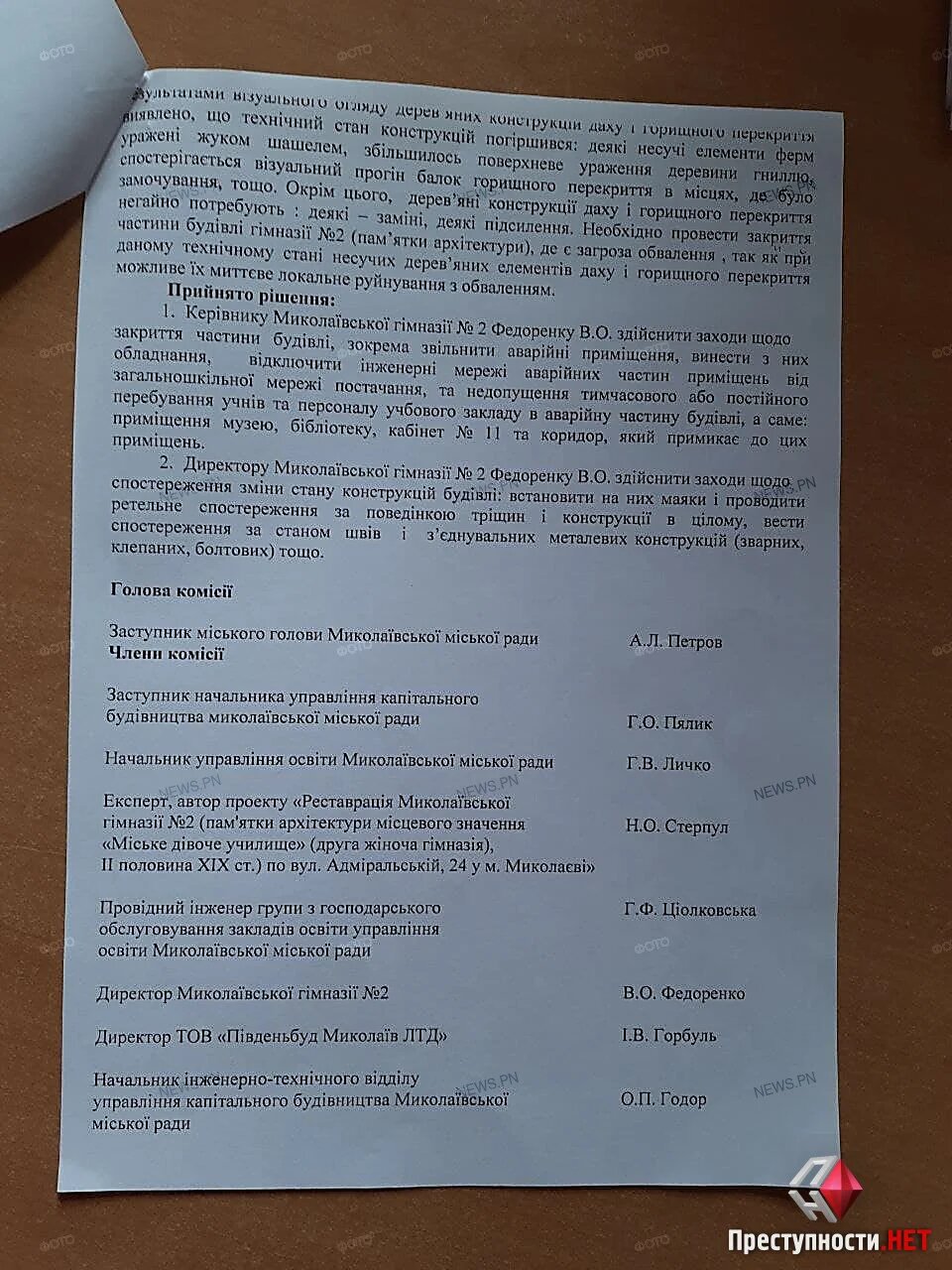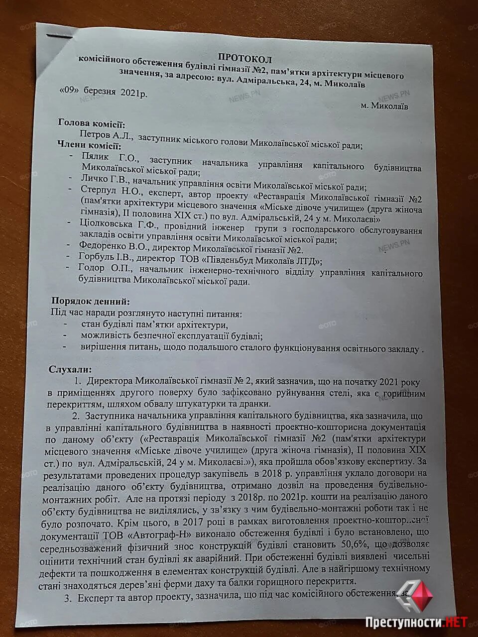 В протоколе комиссии отмечается, что в 2018 году Управление капитального строительства отыгрывает тендер на реставрацию гимназии №2. Однако, на протяжении 2018-2021 года на этот объект средств из бюджета не выделялось и соответственно работы так никто и не начал. Из открытых данных следует, что договор заключили на 53 миллиона 569 тысяч 106 гривен с фирмой «ПівденьБуд Миколаїв ЛТД».