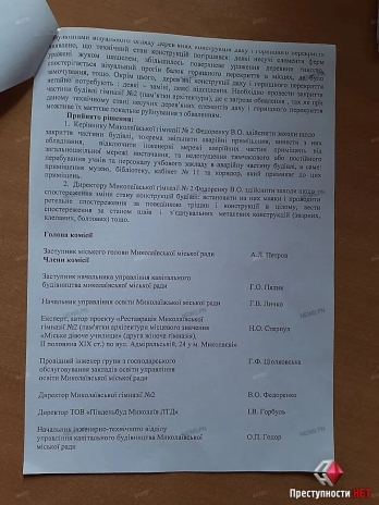 По результатам комиссионного выездного обследования состояния здания, на котором были вице-мэр по гуманитарным вопросам Анатолий Петров, глава управления образования Анна Лычко, замначальника управления капитального строительства, который является заказчиком всех работ, автор проекта реконструкции здания гимназии, директор подрядной организации «ПівденьБуд Миколаїв ЛТД», директор гимназии и инженеры было выпущено предписание, обязующее освободить аварийную часть здания, вынести из нее оборудование, отключить инженерные сети и не допустить прибывания учащихся на опасной территории. Для наблюдения за состоянием конструкций на них нужно установить маячки и провести обследование трещин в помещении.
