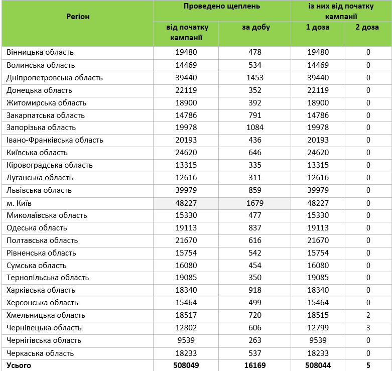 За весь период прививочной кампании наибольшее количество прививок получили 48 тысяч 227 человек в Киеве, а наименьше - также в Черниговской области - 9539.