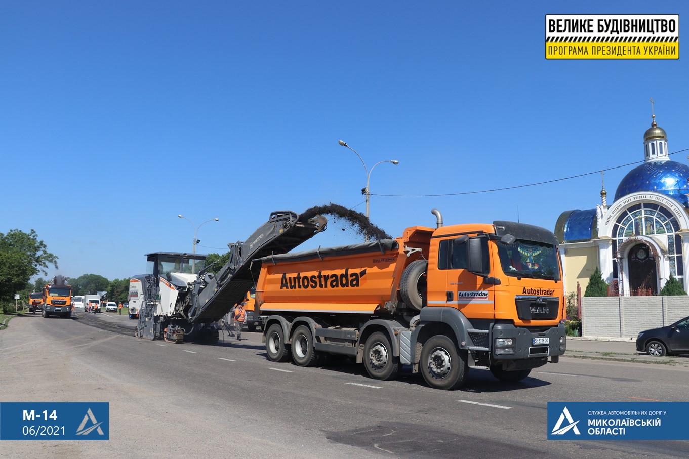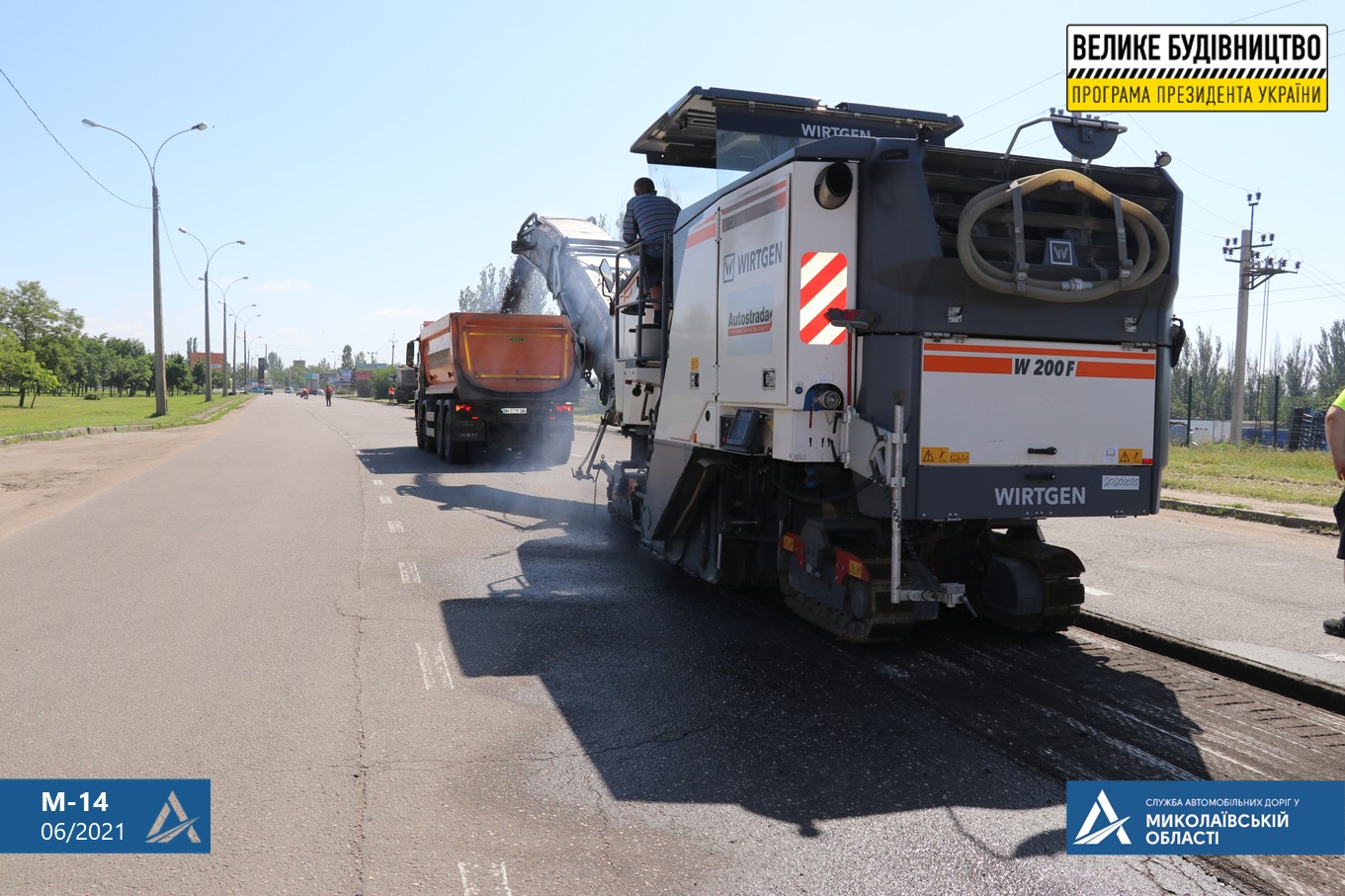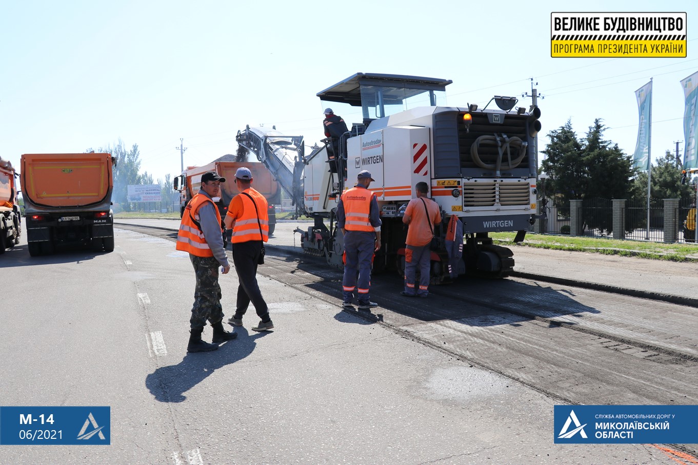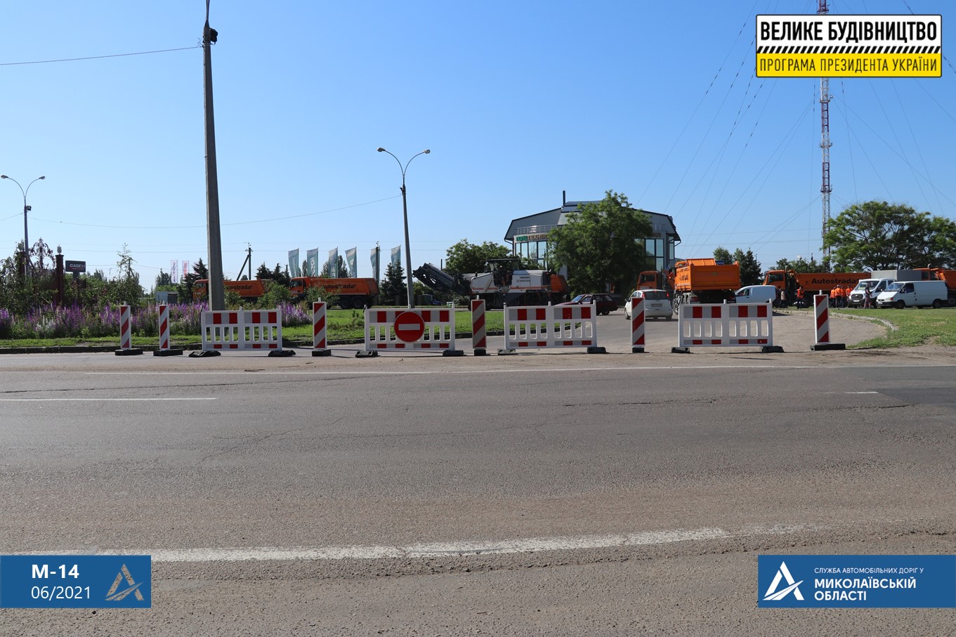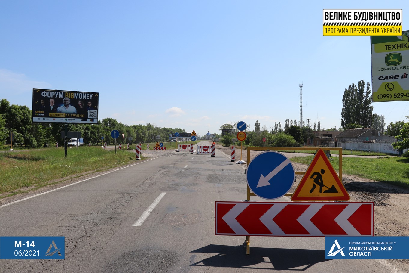 Участок ремонта дороги М-14 на км 129 + 025 — км 139 + 590 совпадает с улицами города Веселиновская, Одесское шоссе, Большая Морская (от Никольской к Пушкинской), Никольская (от Пушкинской до Большой Морской), Пушкинская (от Большой Морской до Ингульского моста), проспект Героев Украины и мостовые переходы через реки Южный Буг и Ингул.