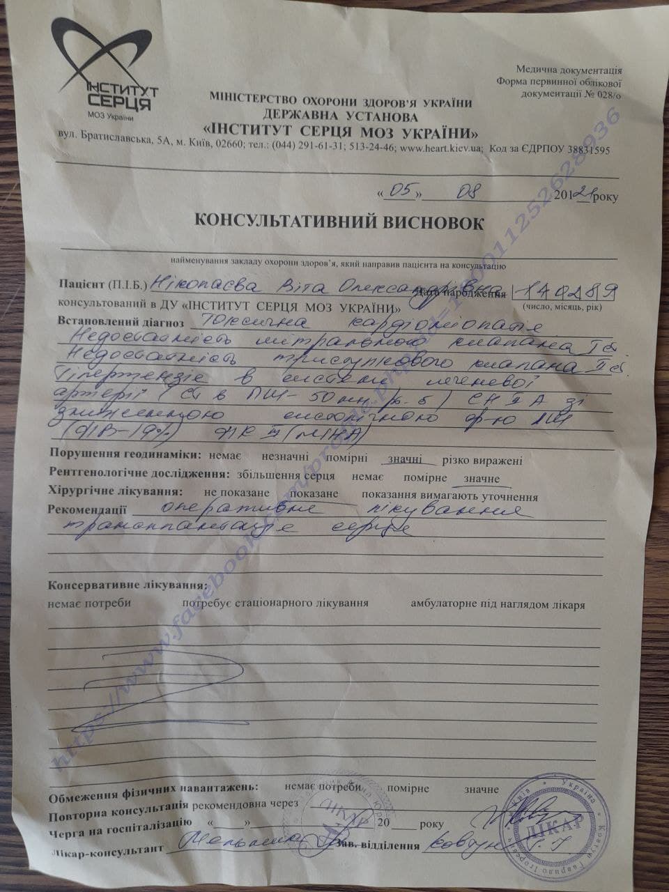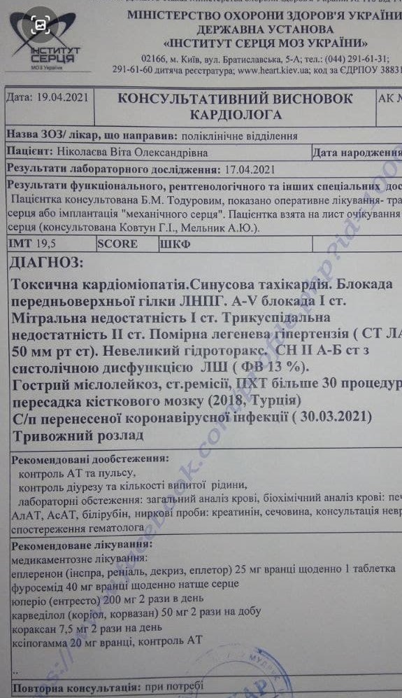 Также Вита Николаева находится в очереди на пересадку механического сердца. Цена такого сердца — около 5 миллионов гривен. К сожалению, программа МОЗ не предусматривает закупку или оплату такого аппарата.