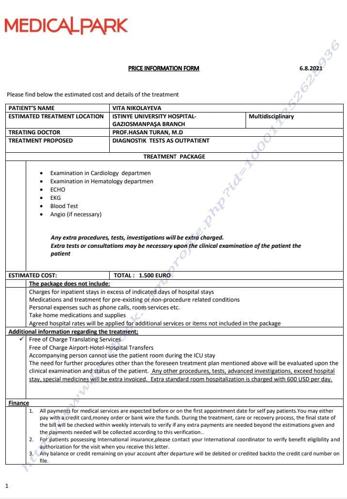 В Украине провести необходимые обследования нельзя, поскольку трансплантацию делали в Турции. Вмешательство в Украине может спровоцировать рецидив острого лейкоза, так как девушка нуждается в пересадке сердца. Более того, сердце Виты Николаевой может не выдержать химиотерапии в случае рецидива болезни.