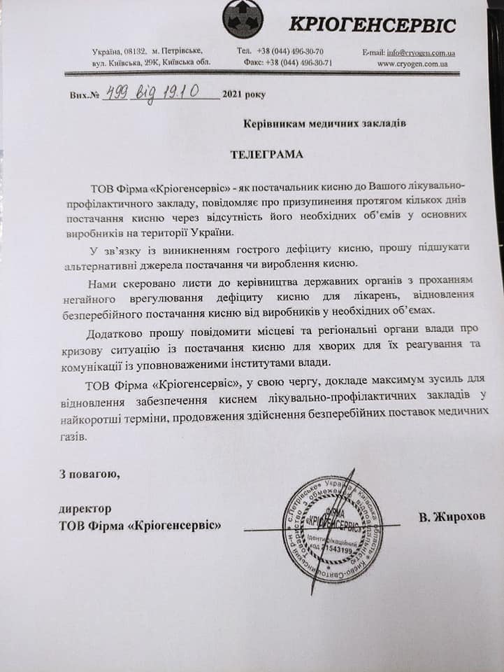 «ООО Фирма «Криогенсервис» как поставщик кислорода в Ваше лечебно-профилактическое учреждение сообщает о приостановке в течение нескольких дней поставок кислорода из-за отсутствия его необходимых объемов у основных производителей на территории Украины. В связи с возникновением острого дефицита кислорода, прошу подыскать альтернативные источники поставок или производства кислорода», — говорится в телеграмме.