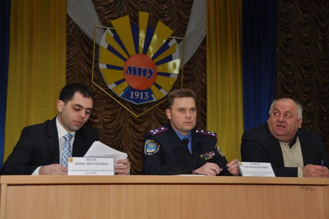 Вчера, 1 февраля 2012 года на базе Николаевского национального университета им. В.А.Сухомлинского состоялась встреча заместителя начальника УГСБЭП УМВД Украины в Николаевской области полковника милиции Сергея Стужука и секретаря Координационного совета по вопросам молодежной политики при УМВД Украины в Николаевской области Дениса Жело со студентами и преподавателями университета, сообщает персс-слу.ба УМВД в Николаевской области.