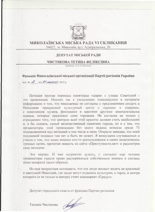 - Петиция против переноса «шара» – это провокация! Именно так я расцениваю появившуюся в интернете информацию о том, что николаевцы не согласны с предложением создать в Николаеве прекрасный культурный центр с парками и скверами, с комплексов музеев, фонтанами и многими другими замечательными идеями, которые предложат сами горожане. Не согласна не только с отрицанием того, что центром всей этой красоты должен стать наибольший и, я бы сказала, самый величественный памятник города, но и с тем, что организаторы этой провокации без моего ведома вписали среди 73 подписавшихся под петицией в том числе и меня, - сказала депутат.
