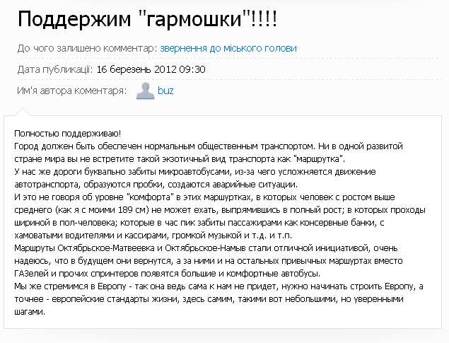 Так, один из горожан высказал предположение, что вскоре под стены исполкома выйдут не водители маршрутных такси, а пассажиры, которые выступают против «маршруток» и «за» нормальный общественный транспорт.