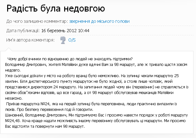Сегодня, 16 марта, на сайте городского головы появилось несколько обращений к Владимиру Чайке от жителей города. Николаевцы выражают свое недовольство тем, что перестали ходить автобусы-«гармошки».