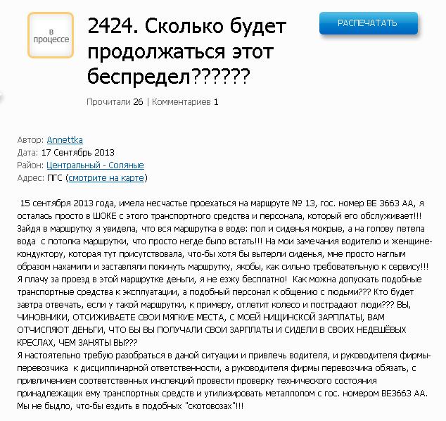 — 15 сентября, имела несчастье проехаться на маршруте № 13, гос. номер ВЕ 3663 АА, я осталась просто в ШОКЕ с этого транспортного средства и персонала, который его обслуживает, - пишет жительница Николаева.