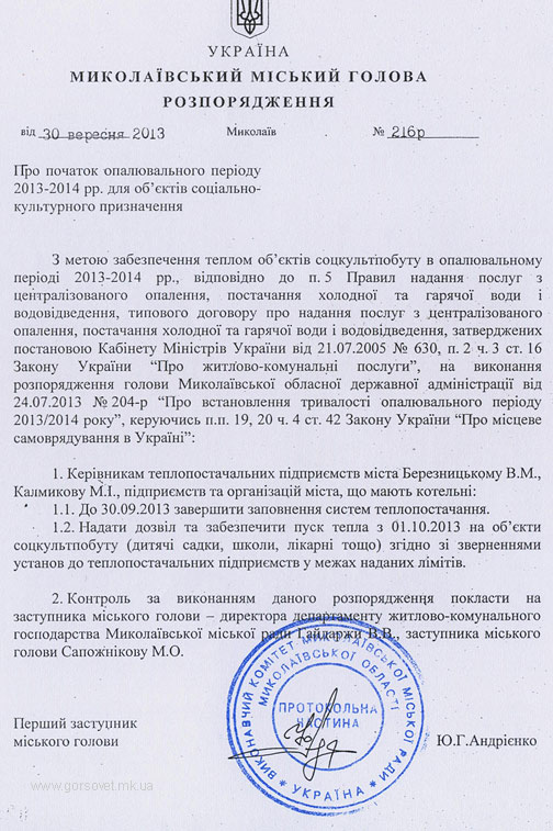Подготовка к отопительному сезону в Николаеве завершена. Вчера, 1 октября, первый заместитель городского головы Юрий Андриенко подписал распоряжение городского головы № 216р «О начале отопительного сезона 2013-2014 гг. для объектов социально-культурного назначения».