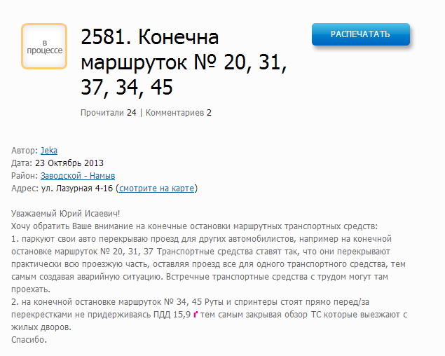 - Например, на конечной остановке маршруток № 20, 31, 37, транспортные средства ставят так, что они перекрывают практически всю проезжую часть, оставляя проезд всего для одного транспортного средства, тем самым создавая аварийную ситуацию, - пишет местный житель.