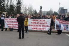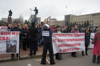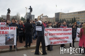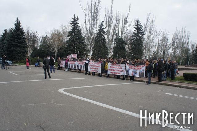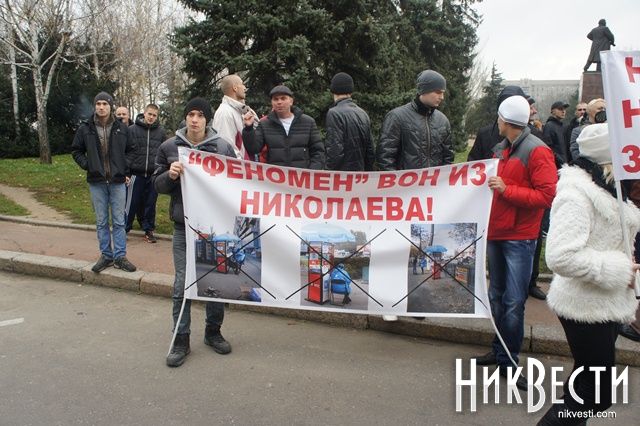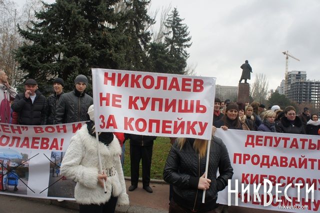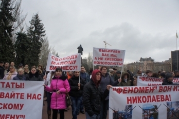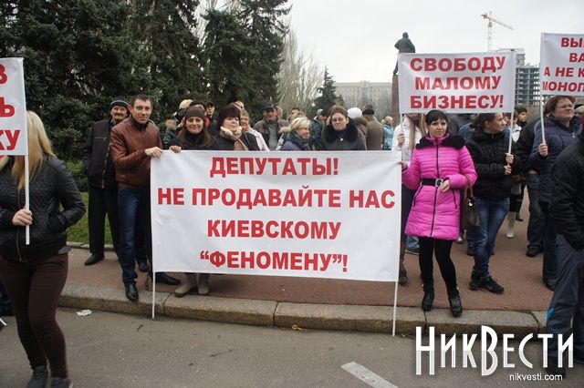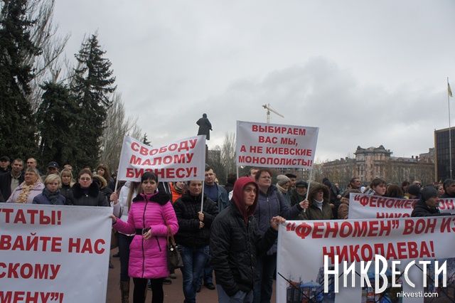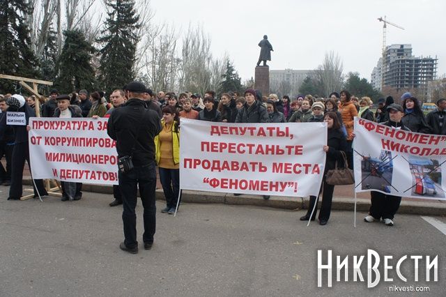 Напротив здания горсовета собралось около 200 человек. Митингующие держали в руках плакаты с надписями: «Свободу малому бизнесу», «Николаев не купишь за копейку», «Депутаты, перестаньте продавать места «Феномену», «Выбираем вас мы, а не киевские монополисты».