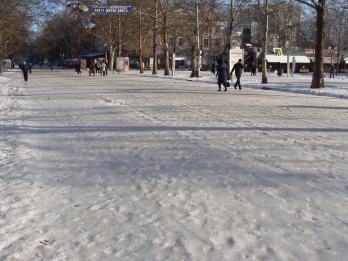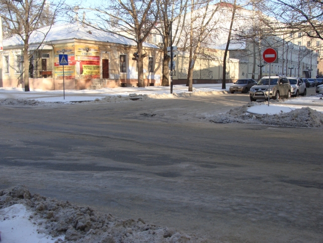 Состояние проезжих частей в центре города можно назвать относительно удовлетворительным. Песок поверх льда посыпан, но скольжение транспорта все равно есть и люди переходят дорогу с большой опаской и осторожностью.