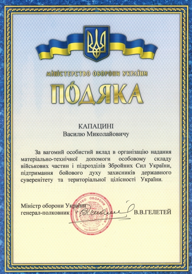 Таким образом, Минобороны отметило Василия Капацыну «за личный вклад в организацию предоставления материально-технической помощи личному составу воинских частей и подразделений Вооруженных сил Украины, поддержания боевого духа защитников государственного суверенитета и территориальной целостности Украины».