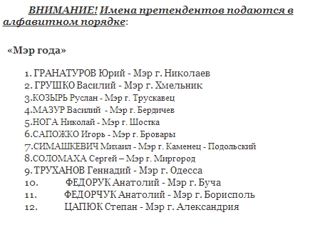 Отметим, что компанию ему составили городские головы Хмельника, Трускавца, Бердичева, Шостки, Броваров, Каменец-Подольского, Миргорода, Одессы, Бучи, Борисполя и Александрии.
