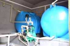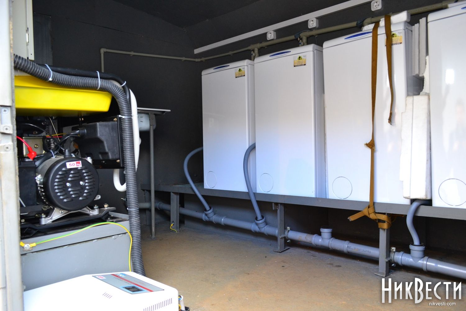 Внутри мобильной прачечной находятся баки для воды, генератор для работы в полевых условиях, стабилизатор напряжения, 5 машинок с вертикальной загрузкой, насосная станция и компрессор.