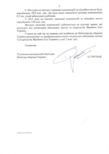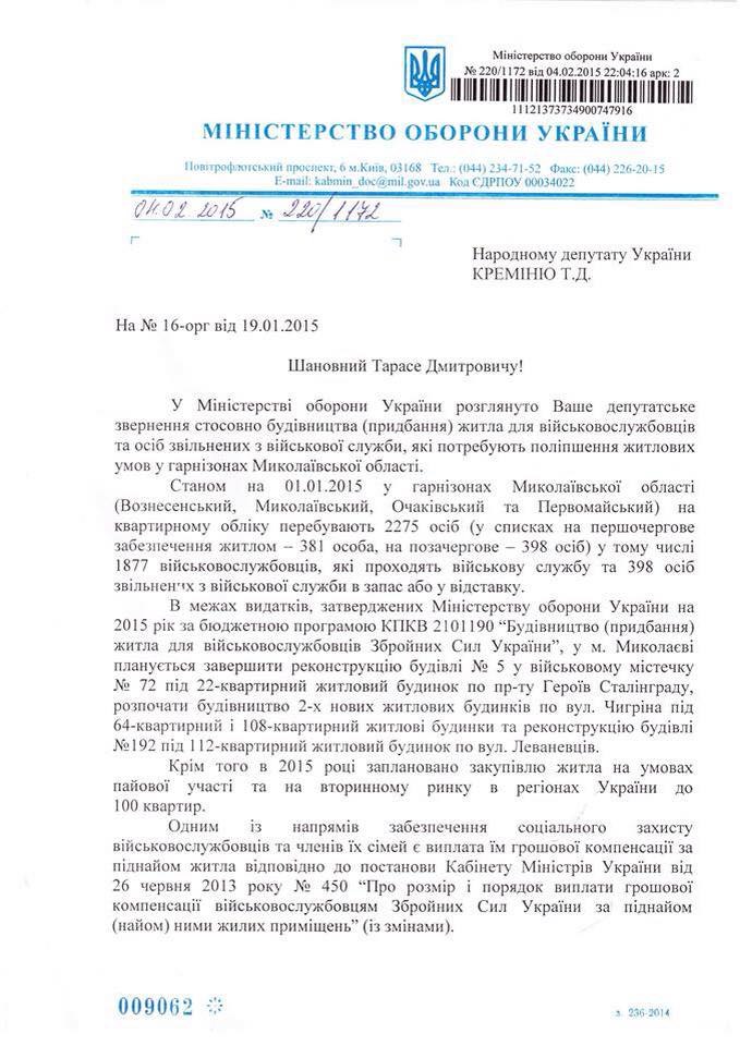 — Из ответа Министерства понятно, что в отличие от прошлых лет, а также в связи с увеличением финансирования нашей армии только в 2015 году в Николаеве реконструируют один, а начнут строительство еще нескольких многоквартирных помещений, а также приобретут до сотни квартир, компенсируют средства за поднаем жилья и тому подобное, — написал Тарас Креминь.