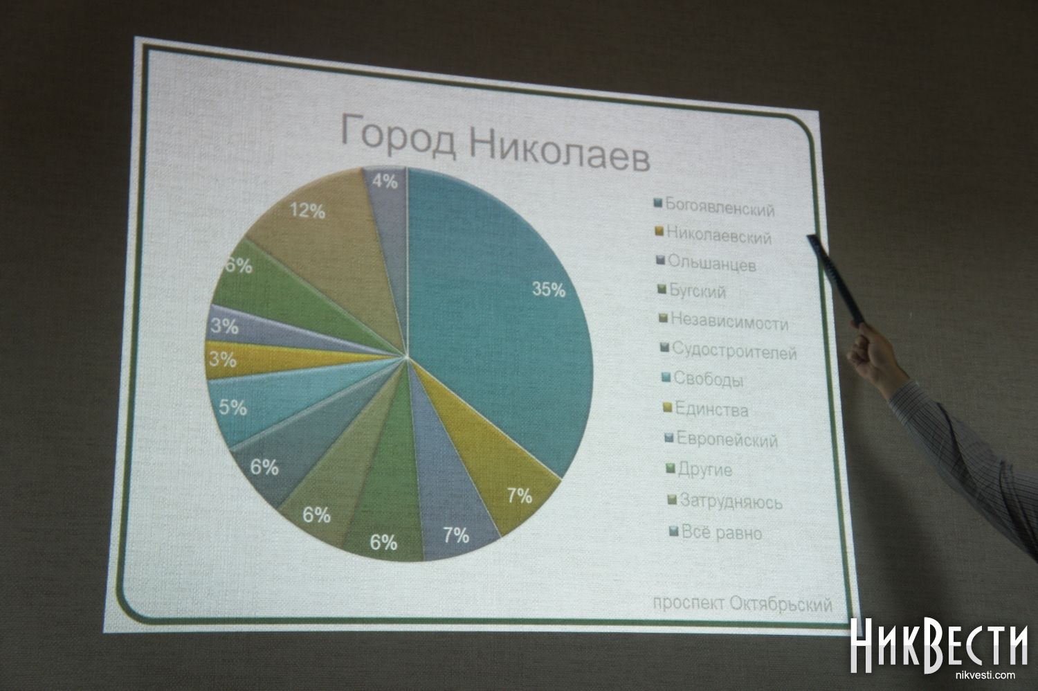 Подведя итоги, активисты выяснили, что большинство горожан поддержало бы переименование проспекта Ленина в проспект Центральный (22,8%). За этот вариант проголосовало бы большинство жителей каждого из четырех районов Николаева. В свою очередь, за переименование проспекта Октябрьского в проспект Богоявленский высказались 35% горожан.