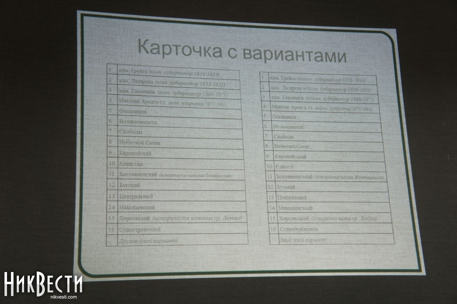 Всего было предложено 16 вариантов ответа, поделенные на три группы: исторические названия, патриотические и нейтральные. Среди них Адмирала Грейга, Адмирала Лазарева, Адмирала Глазенапа, Николая Аркаса, Ольшанцев, Независимости, Свободы, Небесной Сотни, Европейский, Единства, Богоявленский, Бугский, Центральный, Николаевский, Херсонский или Судостроителей. Не согласные ни с одним из них могли предложить свой вариант.