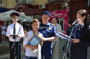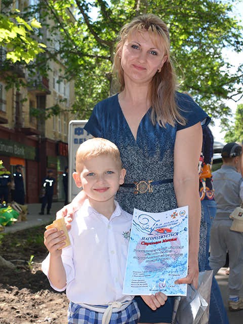 Следующим этапом стало праздничное награждение. Спасатели совместно с представителями Федерации подводной деятельности и спорта в Николаевской области торжественно наградили победителей конкурса детского творчества «У воды - без беды»! 15 талантливых детей получили грамоты и подарки от Главного управления ГСЧС Украины в Николаевской области и Федерации за созданные яркие рисунки, видеоролики, презентации и поделки в стиле оригами. Затем получили подарки победители Всеукраинского литературного конкурса и рисунка на асфальте.