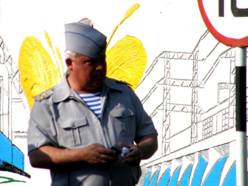 С 9 часов на КПП 79-й отдельной аэромобильной бригады Сухопутных войск Вооруженных Сил Украины десантников и гостей встречал командир части, полковник Константин Масленников. На фоне психоделических картинок на стене забора КПП, командир части Масленников встал так, что за его спиной образовались «крылышки» и «усики», отчего появилось явно уловимое сходство с апостолом Петром, у ворот (так сказать, тоже КПП) Рая.