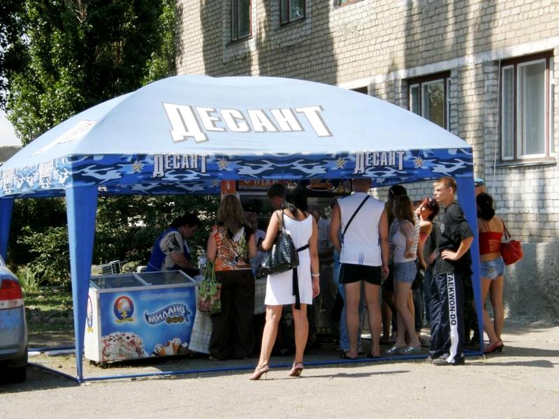 Перед воротами КПП продавалась десантная амуниция, значки, береты и прочее. На территории части расположилась палатка с рекламой пива «Десант» (а какая же еще?).