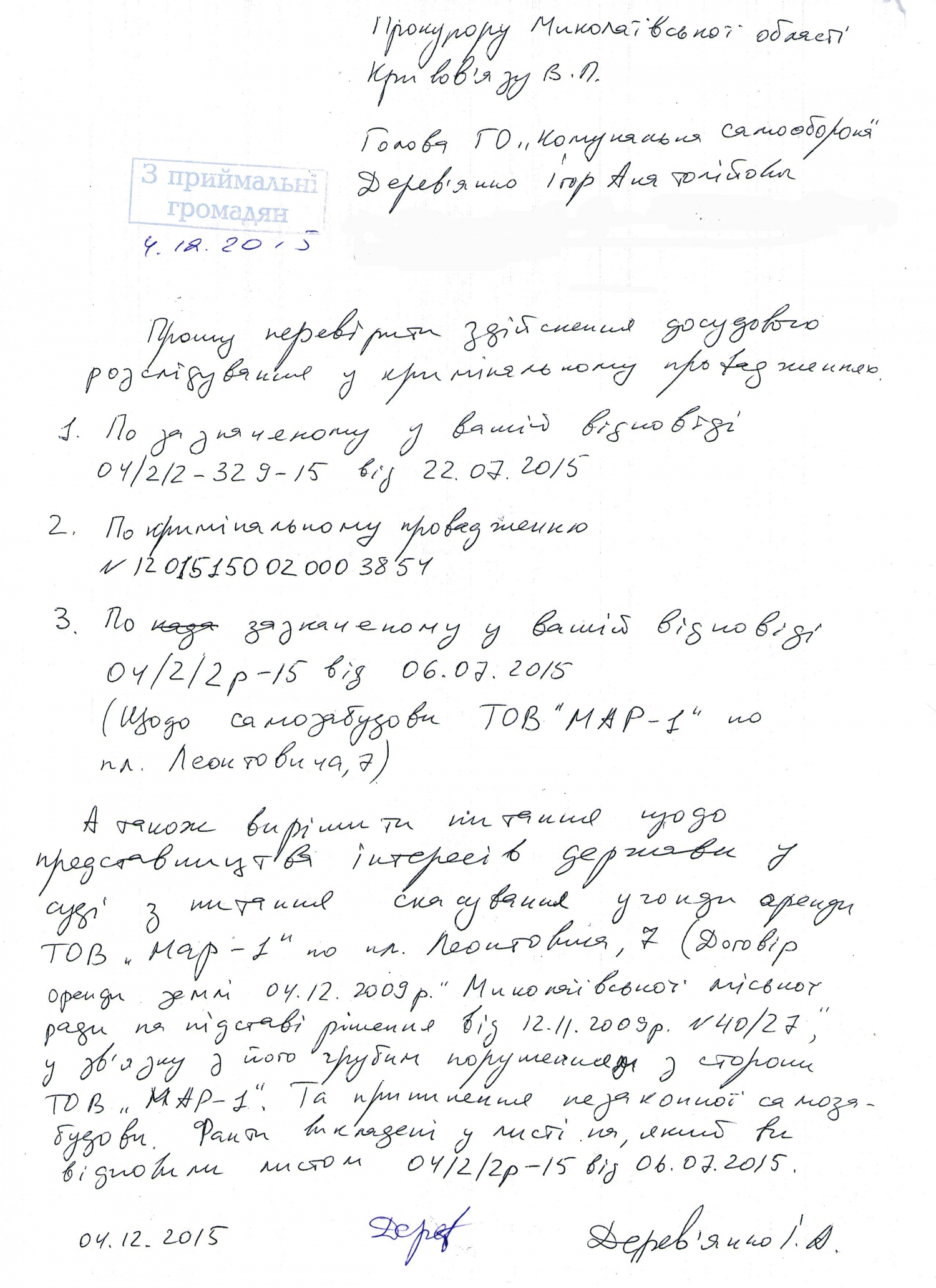 – Поэтому еще с весны 2015 активисты неоднократно обращались в областную и городскую прокуратуру с требованием в судебном порядке отменить договор аренды на земельный участок для обслуживания торгового комплекса ООО «МАР-1» по улице Леонтовича, 7, прекратить самострой, снести незаконно построенное. Восстановить законность и привлечь к ответственности виновных. Последний раз такое письменное обращение областному прокурору было сделано 04.12.2015 года, – добавил Игорь Деревянко.