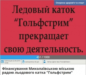 Как известно, в петиции, которая собрала в короткие сроки необходимое количество голосов, инициативная группа по сохранению ледового катка «Гольфстрим» просит мэрию рассмотреть вопрос об уменьшении арендной платы за землю, на которой расположен Николаевский ледовый каток, и выделении целевого финансирования для оплаты затрат, связанных с производственным потреблением электроэнергии.
