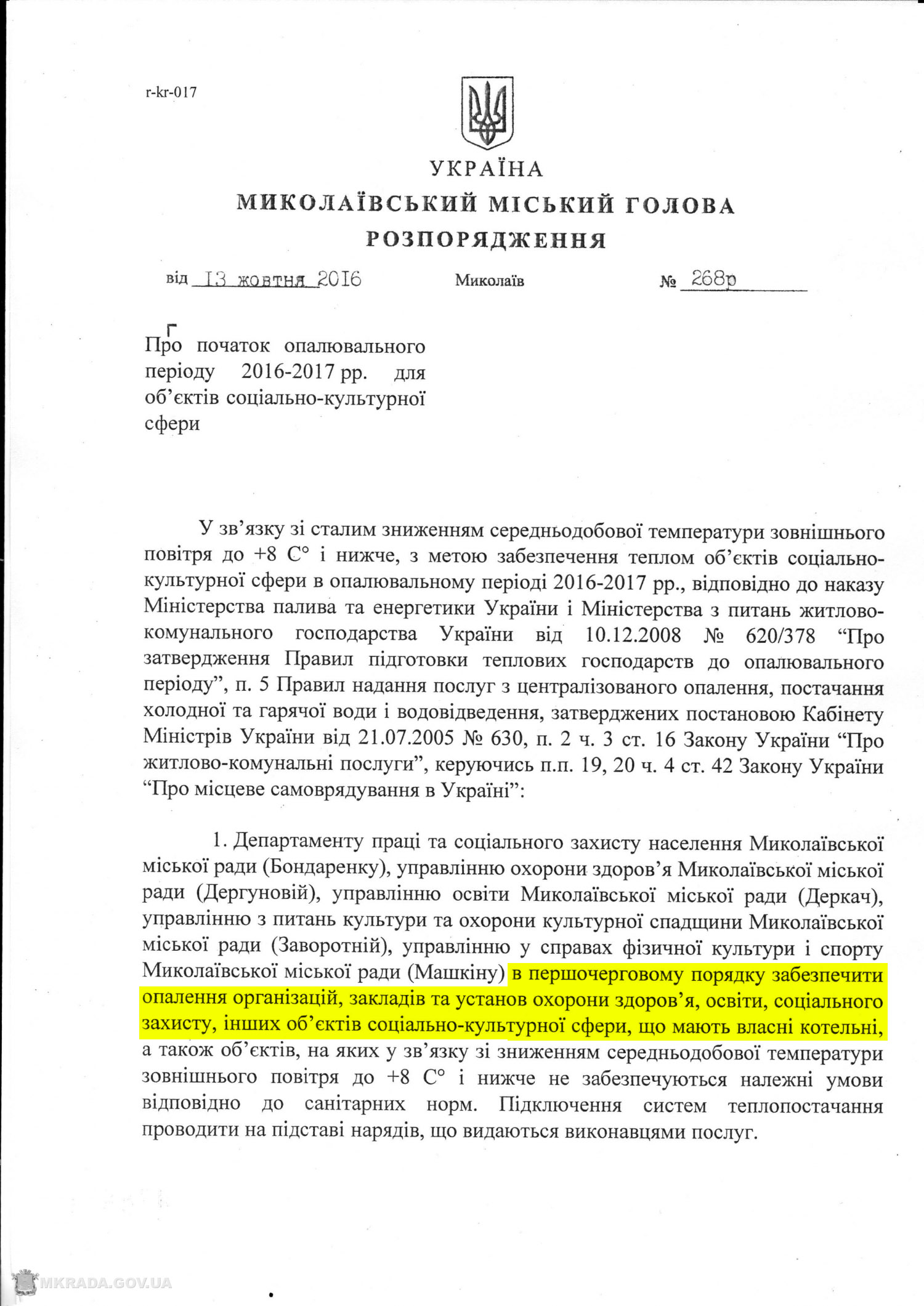Городской голова Александр Сенкевич сегодня, 13 октября, подписал распоряжение о начале отопительного периода для объектов социально-культурной сферы.