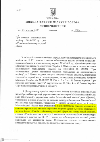 Ранее сообщалось о том, что заместитель главы Николаевской облгосадминистрации Вячеслав Бонь и Николаевский городской голова Александр Сенкевич в ходе селекторного совещания при участии премьер-министра Украины Владимира Гройсмана заявили, что в области потребители и производители тепла на 100% готовы к отопительному сезону.