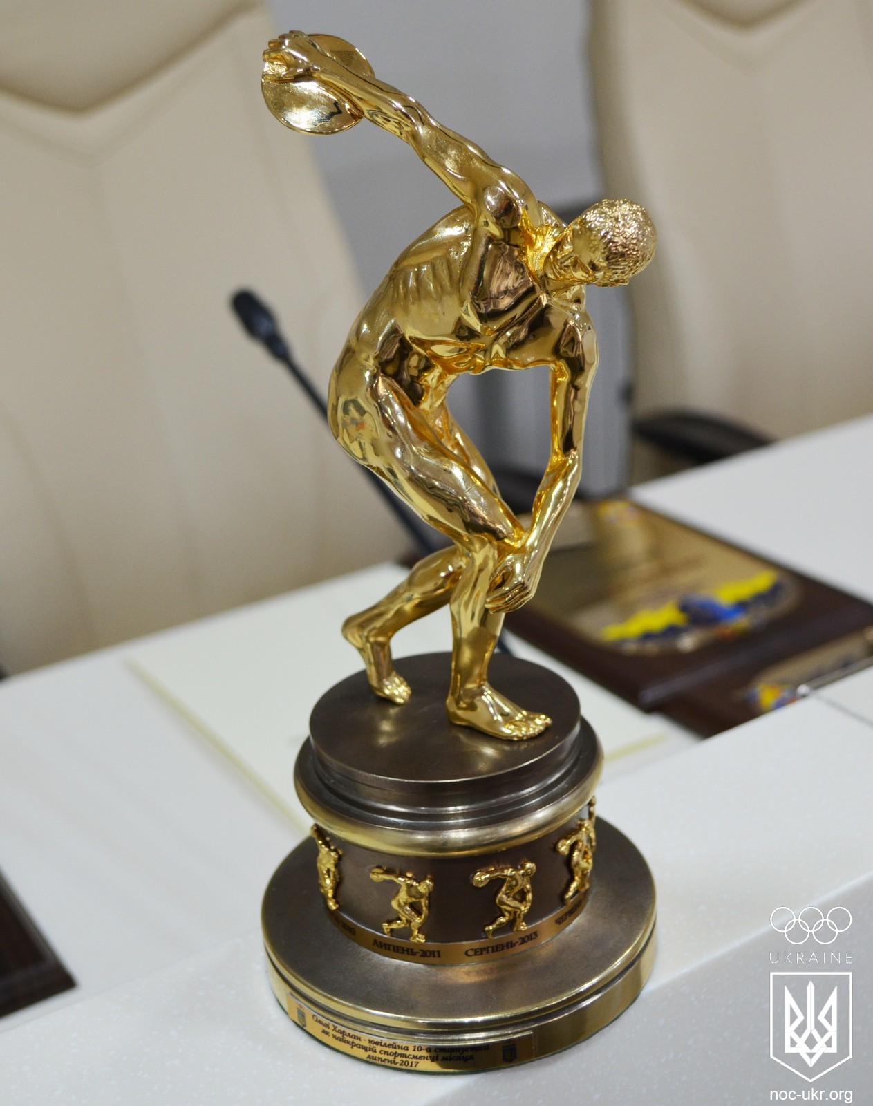 Кроме денежной премии и памятного диплома, специально по случаю рекордной, десятой награды Ольги Харлан, НОК Украины разработал новый, эксклюзивный дизайн статуэтки - на ней 9 маленьких изображений статуэток лучшего спортсмена месяца с датой получения этой награды.