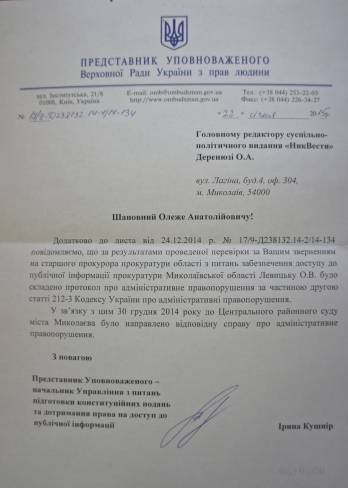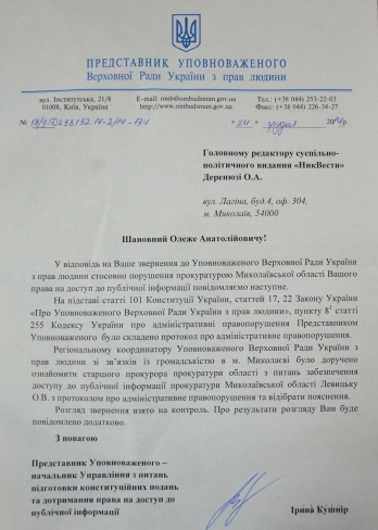 10 декабря я обратился с жалобой к Уполномоченному Верховной Рады Украины по правам человека Валерии Лутковской. Уже через 2 недели на старшего прокурора Ольгу Левицкую, которая отвечает в областной прокуратуре за вопросы, связанные с доступом к публичной информации, был составлен протокол по статье 212-3 КУпАП «Нарушение права на информацию и права на обращения» в части не соблюдения Закона Украины «О доступе к публичной информации».